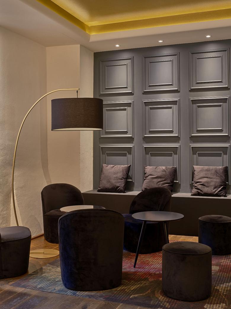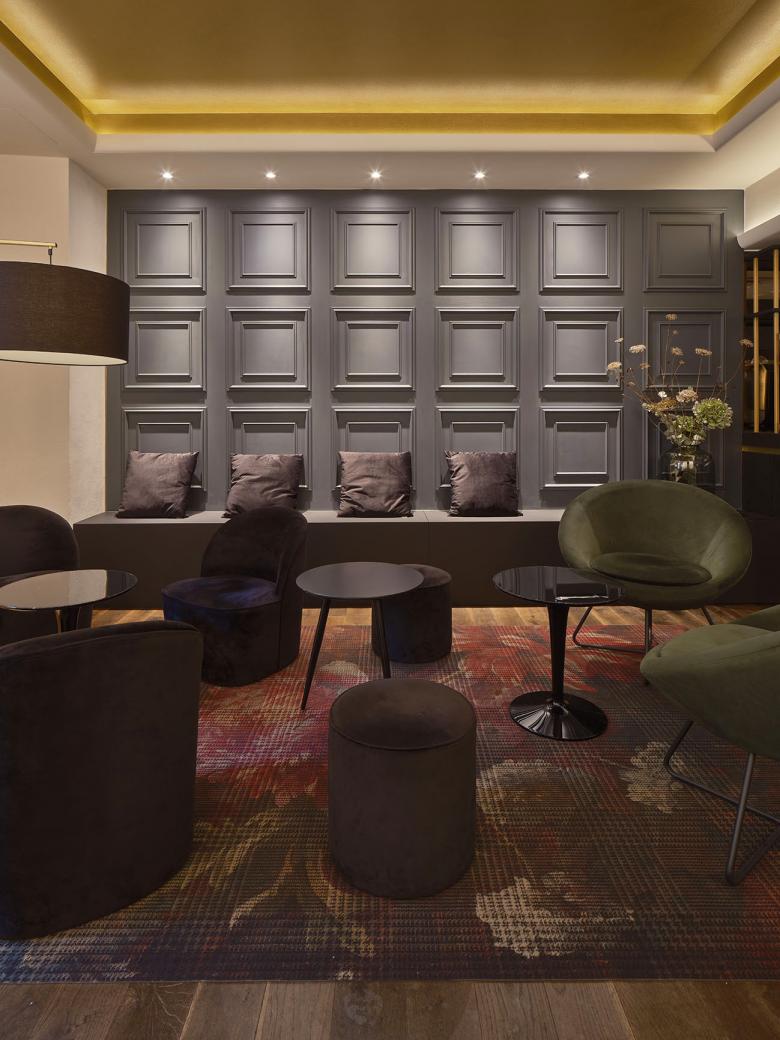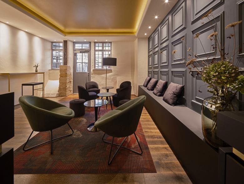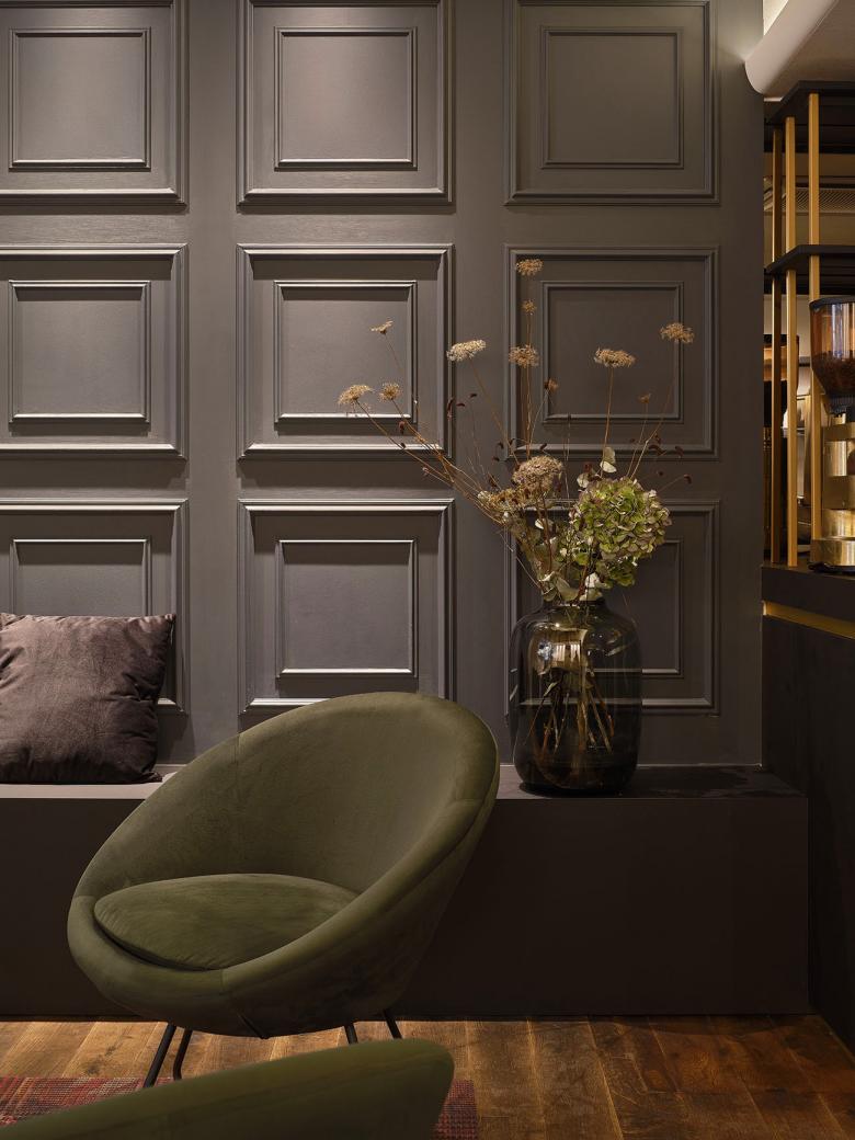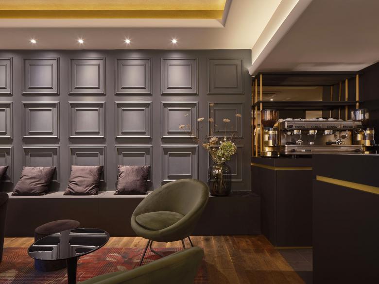 Um die Atmosphäre und Struktur des Raums zu verbessern, wurden drei Deckenfelder mit indirekter Beleuchtung eingebaut, die jeweils eine bestimmte Zone markieren. Diese befinden sich im Lounge-Bereich, im Gang vor der Bar und über dem Bereich der Merchandising-Ware. Die Beleuchtung der Deckenfelder trägt zur Atmosphäre bei, während die restliche Beleuchtung als funktionale Arbeitsbeleuchtung in der Bar und zur Hervorhebung der Sektflaschen in den Wandregalen dient. Ein rosafarbener Stoff im Eingangsbereich nimmt die Verpackungsfarbe des „Kessler Hochgewächs Rose Brut“ auf. Die Treppenstufen wurden zu bequemen Sitzbereichen umgestaltet, und die ursprünglich ungemütlichen Bodenfliesen mit schwarzem Schichtstoff überdeckt. Die „Kassettenwand“, inspiriert von Kessler, greift den historischen Charakter des Gebäudes auf und ist in Flaschengrün gehalten. Die Hauptfarbtöne Messing, Grün, Schwarz und Rosa prägen das Farbkonzept. In den Loungebereichen wurden zusätzlich Teppiche verlegt, die die Atmosphäre der Stuttgarter Bar aufgreifen und gleichzeitig das neue Wanddesign ergänzen.