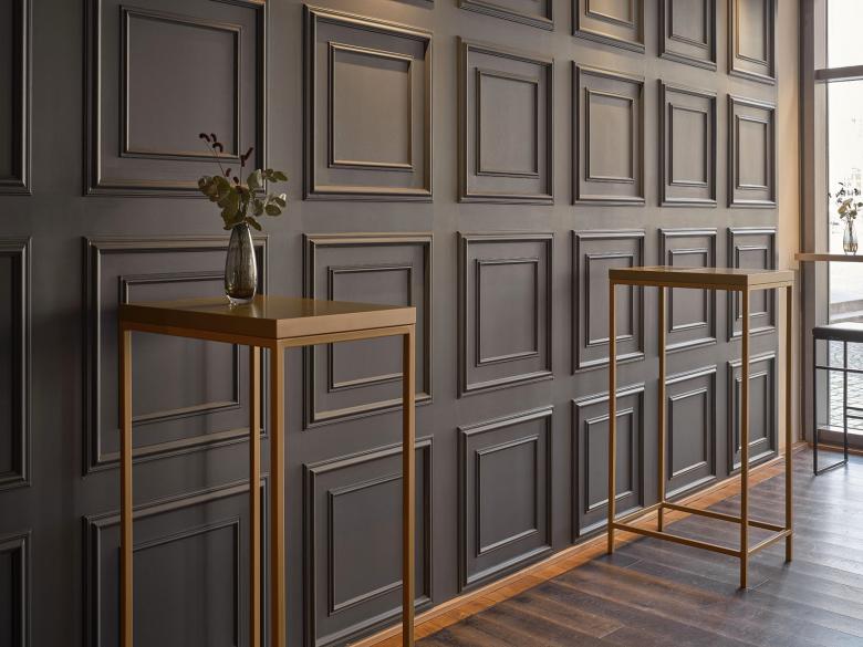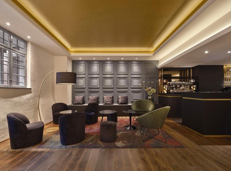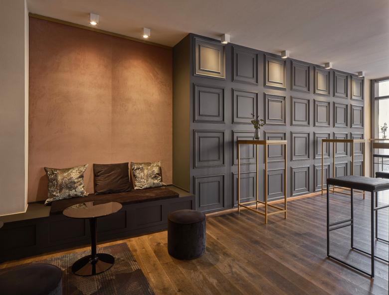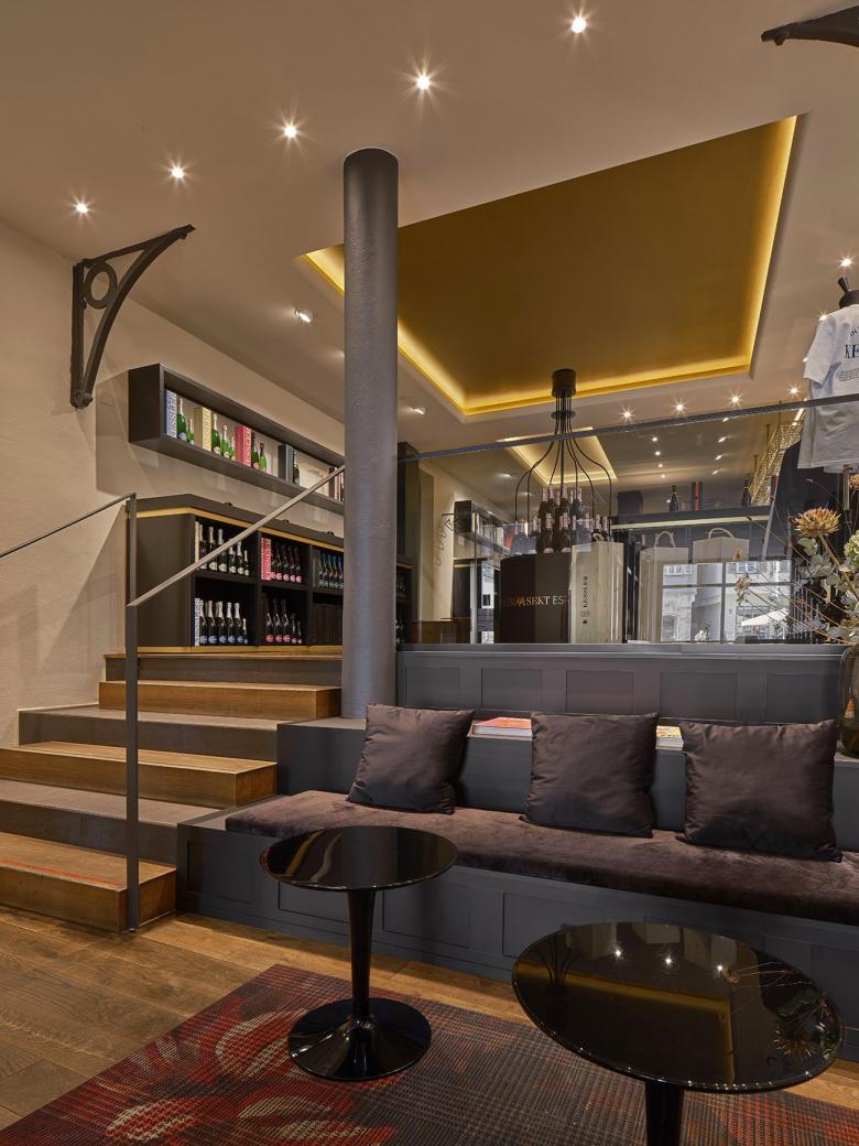 Eine besondere Herausforderung stellte die vorhandene Decke dar, die zuvor unruhig und mit vielen Versprüngen gestaltet war. Zudem sollten markante Designelemente übernommen werden, um die Verbindung zum Stuttgarter Laden zu bewahren. Dazu gehörten der Georges-Aufdruck auf dem Parsolspiegel, das messingfarbene Glasregal für die Sektgläser, die schwarz-messingfarbene Theke und die Stehtische. Auch die Sekt-Präsentationsflächen an den Seiten sollten überarbeitet werden, und es sollten zusätzliche Sitzplätze geschaffen werden, um den Komfort für die Kunden zu erhöhen. Zusätzlich sollte die neue Decke mit drei beleuchteten Feldern für eine räumliche Zonierung sorgen. Die Messingfarbe sollte dabei als wiederkehrendes Markenzeichen in zwei der Deckenfelder erscheinen.