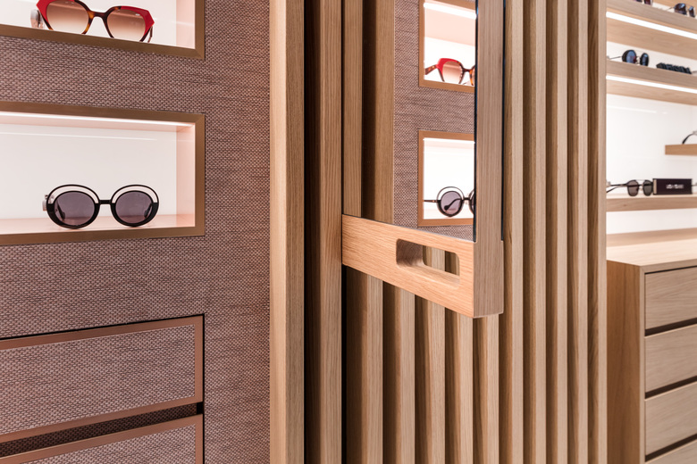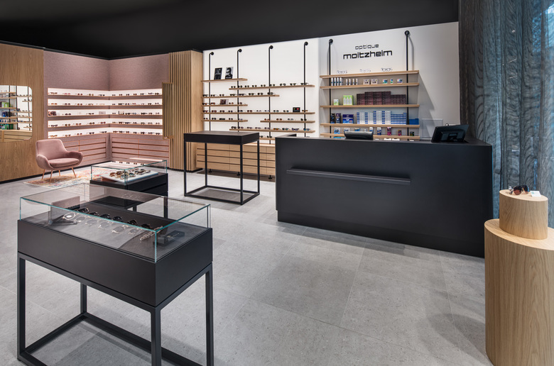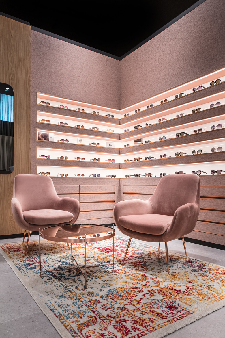 Die Verkaufsfläche von 115 m² beeindruckt durch eine Raumhöhe von fast 5 Metern. Die Wände und die Decken sind ab der Höhe von 3 Metern schwarz gespritzt. Dezente LED-Strahler lassen die dunkle Decke zu einem brillanten Sternenhimmel werden. Dieses imposante Raumvolumen wird geschmackvoll unterstrichen, durch riesige Leuchtimages. Insgesamt schenken die gewählten, eher gedeckten, natürlichen Farben und Materialien ein sowohl wohnliches als auch modernes Ambiente. Große, anthrazitfarbene Bodenfliesen harmonieren gleichermaßen mit dem dunklen Metallrahmenmobiliar und den Brillen-Präsentationswänden in heller Eiche. Eine gemütliche Loungeecke, mit rosa-pastell-farbenen Sesseln lädt zum Verweilen ein. Das Shopdesign bietet den Kunden raffinierte Details zum Entdecken. Herausziehbare, drehbare Spiegel, Präsentationswände in Textiloptik und eine spannende Kombination aus verschiedenen metallischen Farben und Elementen.