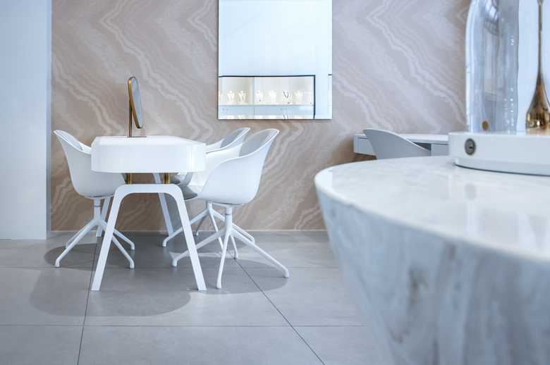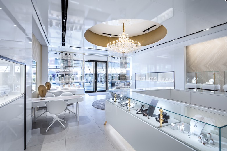 Das klassische und hochwertige Mobiliar wurde erhalten, aufbereitet und teilweise neu platziert. So findet sich der opulente Verkaufstresen nun im hinteren Teil des Ladenlokals wieder. Zentrum und Highlight des Fachgeschäftes bildet die Mittelraumgestaltung. Das große, runde Deckenfeld wurde aufgearbeitet und bildet, gemeinsam mit dem riesigen Kronleuchter, eine Art Raum-Kuppel. Darunter befindet sich ein Präsentationstisch der als Halbkugel ausgebildet ist. Auf ihm werden, unter hohen Glasglocken, besondere Schmuckstücke präsentiert.