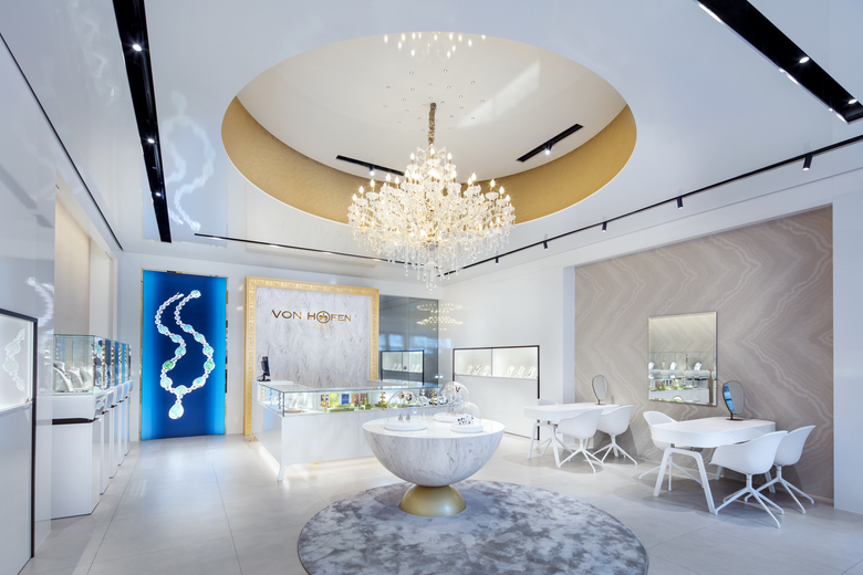 Elfriede von Hofen führt einen Traditionsbetrieb in der Stuttgarter Innenstadt. Der Juwelier ist bekannt für seine Hochwertigkeit und Kompetenz - nicht zuletzt auf Grund der hauseigenen Meisterwerkstatt für Uhren und Schmuck. Nun wechselte das Familienunternehmen die Räumlichkeiten. Bei diesem Umzug verdoppelte sich die Verkaufsfläche des exklusiven Fachgeschäftes. In dem neuen Ladendesign sollten sich sowohl die Farben als auch Materialien des vorherigen Geschäftes wieder finden. Creme Töne, Marmor und Gold sind die Farben und Materialien, die den alten Ladenstil bestimmten. Aufgabe war es, eine edle und ansprechende Mischung aus Luxus, Wertigkeit und Opulenz zu finden. Die Schmuckpräsentation sollte dabei eher sachlich und klar sein.