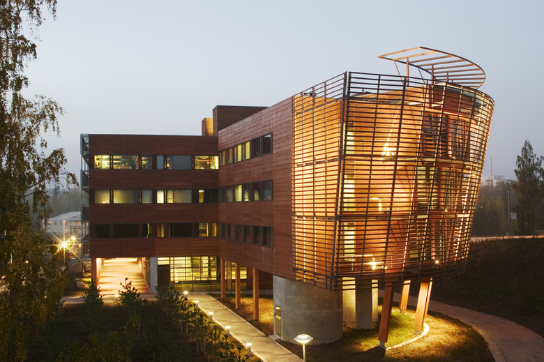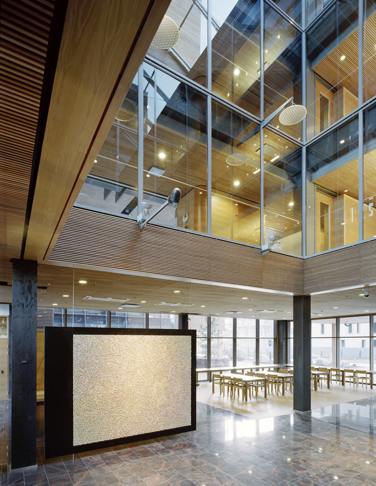 As an opening to new possibilities for wood, Finnforest organised a design competition for a modular office in spring 2003, inviting architects from Finland, Sweden and Denmark to participate. The aim was to achieve an industrial export product, which could be adapted in size and assembly to suit different situations. The winner was the entry of Pekka Helin’s team, “Sydänpuu” (‘heartwood’). On completion, the building was the highest wooden office building in Europe. The programme included 240 workplaces.