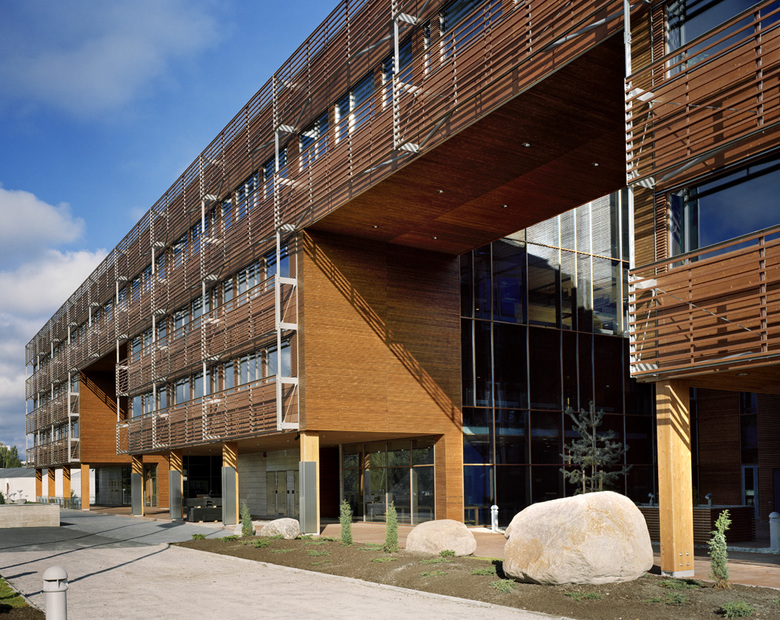 The life expectancy of the basic structures was set at over a hundred years, and the solutions were to conform to the average cost level of office buildings. The exterior walls are mainly made of elements with laminated wood studs, which were specially developed for this building. Wood is also used in facade louvres. The three balconies facing east are of glulam wood. The entire frame of the office part with its columns, L-beams and stressed skin panels are made of laminated wood. The lift wells, escape routes, ventilation plant room and basement car park are of concrete.