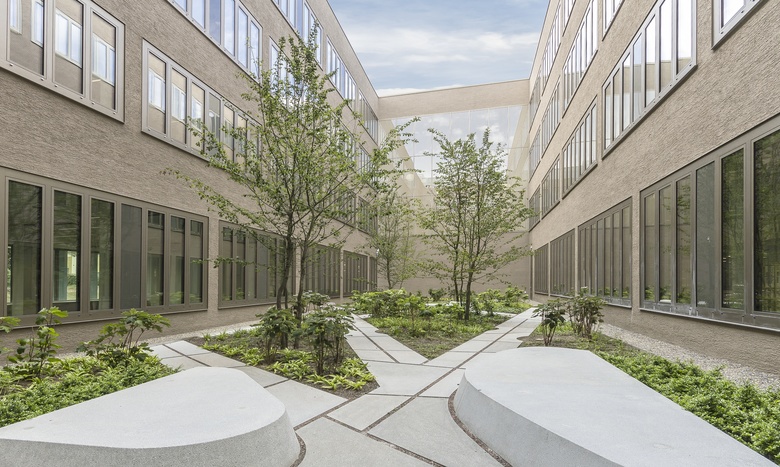 Er bildet zum Stadtplatz und zum Campus-Forum stadträumlich wirksame Baukanten, definiert so den öffentlichen Raum als Adresse und übernimmt mit deutlicher Setzung die Funktion des Entrées zum Campus. Die Eingänge erfolgen entsprechend von beiden städtebaulich wichtigen Seiten über gedeckte Vorbereiche in das Bibliotheksfoyer. Wie eine fließende Raumlandschaft öffnet sich dieses wechselseitig zu den Außenräumen und vernetzt dadurch den Campus mit der städtischen Nachbarschaft.