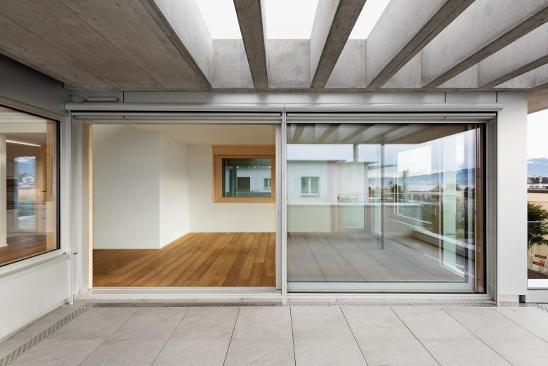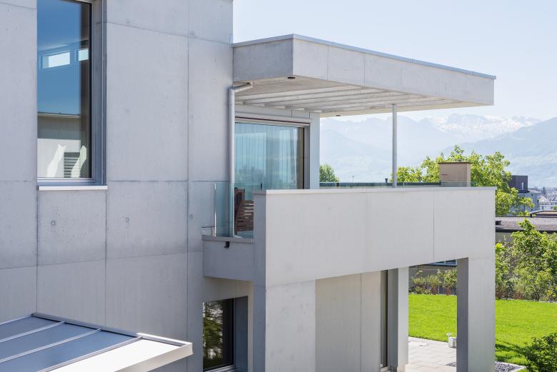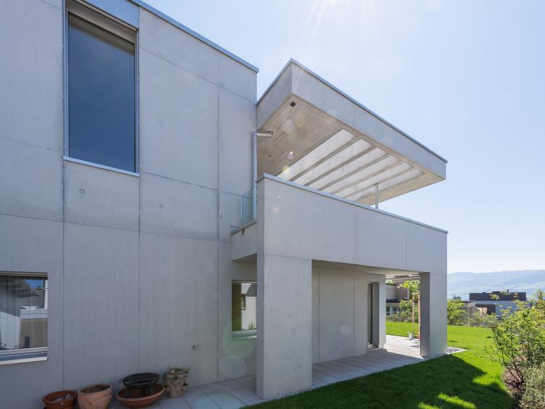 Grundriss und Raumabfolge: Die Raumabfolge im Wohngeschoss entwickelt sich von Entrée zum Esszimmer, weiter zum Wohnzimmer mit Terrasse. Der Mittelpunkt bildet das überhohe Esszimmer mit Oblicht, an welches die Küche direkt angrenzt. Das Wohnzimmer lebt vom weiten Ausblick auf den See und die Berge und dem starken Bezug zur Terrasse. Dank dem Innenausbau aus Fichtenholz, den Fenstern mit tiefer Holzleibung und den grosszügigen französischen Fenster ist der Wohnbereich trotz hohem Glasanteil sehr gemütlich. Die Überdeckung der Terrassen mit Betonlamellen führen zu einem spannenden Spiel von Licht und Schatten.
