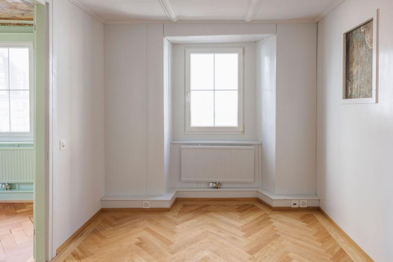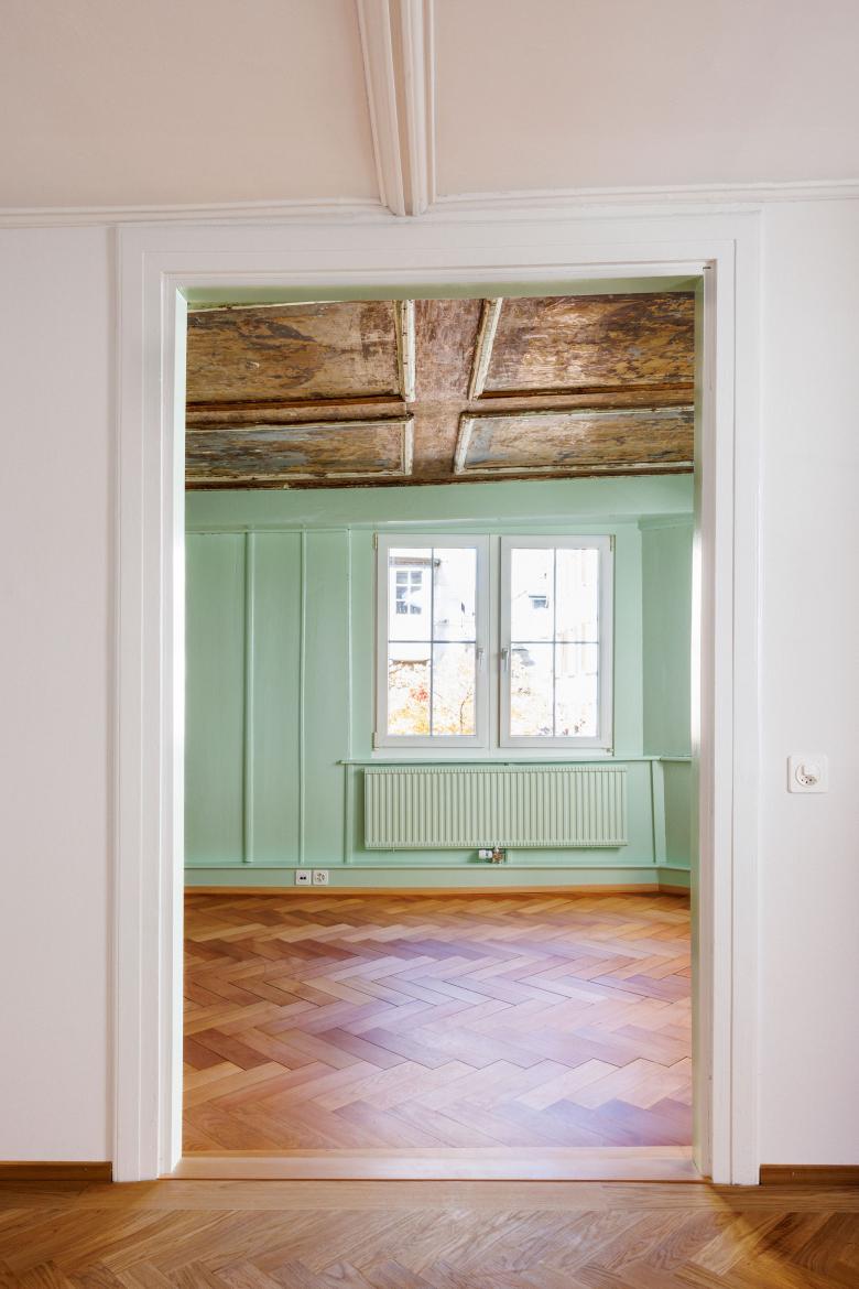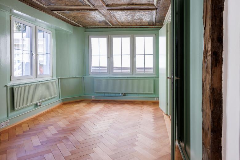 Das Altstadthaus an der Ecke Oberdorfstrasse-Scheitergasse, auf halber Strecke zwischen Rämistrasse und Grossmünster, befindet sich an prominenter Ecklage innerhalb der Zürcher Altstadt. Die vornehme Lage äussert sich auch innenräumlich im hellen Eckzimmer, welches mit einem barocken Wand- und Deckentäfer reich ausgeschmückt ist. Eine Wandmalerei, welche auf vorreformatorische Zeit datiert wird, befindet sich an der Brandmauer zum Nachbarn und zeigt einen exotischen Vogel in einem Rankenmotiv.