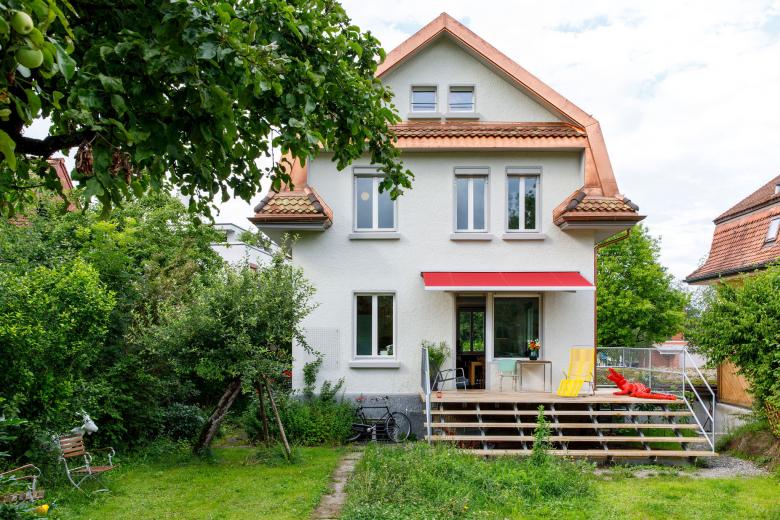 Das Einfamilienhauses mit Baujahr 1910 hat im Zusammenhang mit den Grundrissanpassungen eine grundlegende energetische Sanierung erfahren. Der Haupteingriff wurde im Erdgeschoss vorgenommen: Durch das Einfügen eines Stahlträgers konnte das ganze Geschoss geöffnet werden und wird neu als grosszügiger Wohnbereich genutzt. Dank flexiblen Unterteilungsmöglichkeiten kann ein Teilbereich auch als Gästezimmer bewohnt werden. Durch neue Fenster wird der Sichtbezug zum Garten gestärkt und die Wohnqualität erhöht. Als Erweiterung des Wohnbereiches erstreckt sich die neue Holzterrasse in den Aussenraum und führt über die breit angelegte Treppe in den Garten.