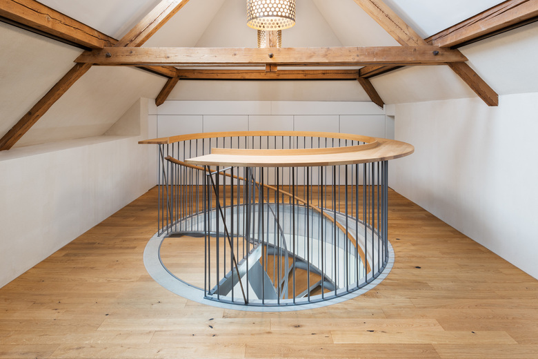 Durch das Einfügen einer neuen Betonstruktur und der Wendeltreppe wurde das Dachgeschoss
