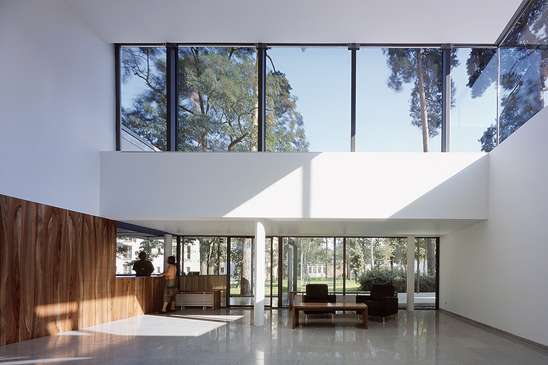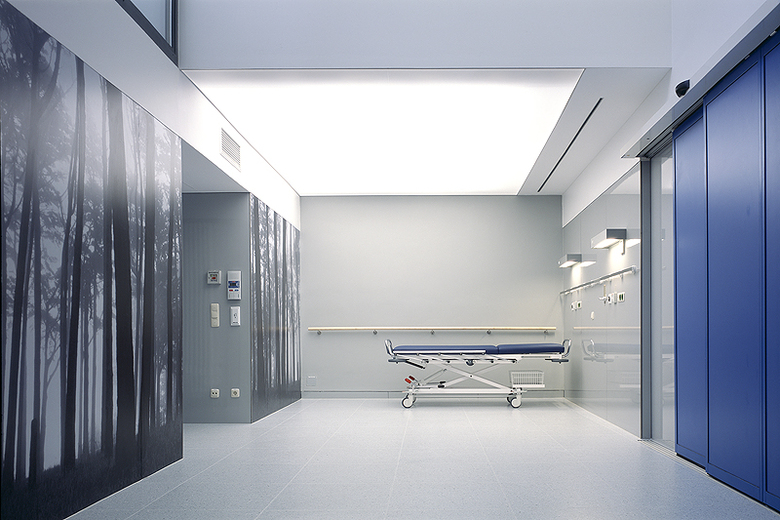 On the campus of the Evangelisches Waldkrankenhaus in Berlin Spandau, a simple existing building from the 1970s was converted into a modern surgical center. This is intended to take account of changes in the health system and relieve the inpatient operating area. The design is designed to ensure the hospital's future viability even under changing medical conditions. The outpatient operating centre has two fully equipped operating theatres and an operating theatre, which can be retrofitted as an additional 3rd surgery room if required. Targeted ceiling openings create generous two-storey room volumes in the entrance hall and in the preparation room.