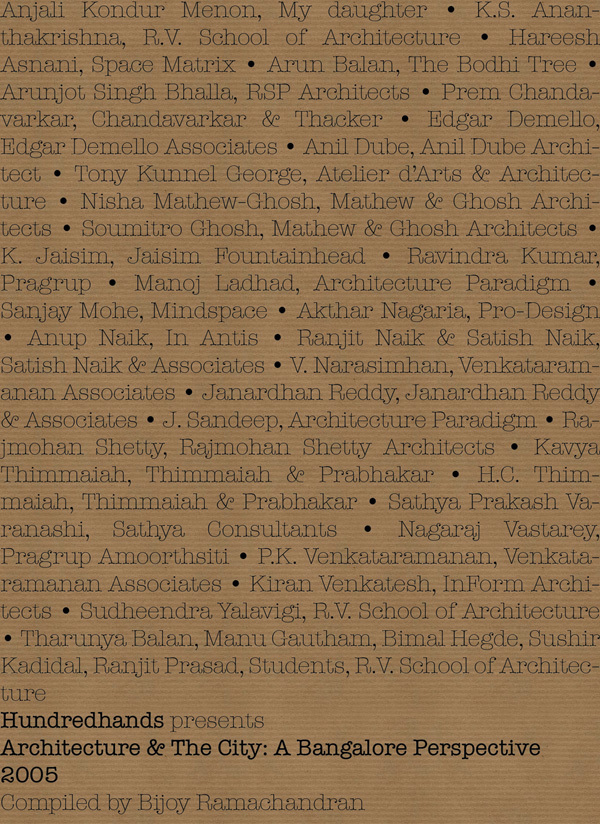 In late July of 2005, I was invited by Inside Outside magazine to participate in their expo in Bangalore. The idea was to give young architects like me a chance to get noticed. I took the stall, but instead of designing and building the perfect bedroom, I set it up with a TV, two speakers and an amp and screened a film. It was odd, to put it mildly. The film was 82 minutes of architects talking about design, the profession, public processes, professional frustrations, and personal manifestos. I kept a diary on site and it is filled with random comments by the visitors on issues rarely discussed in the public domain, issues to do with our built environment, its impact, the political and social meanings attached to it, and the place of design in our lives. It is time now for these discussions to find their way into mainstream media - newspapers, television, etc. Without this extensive and critical coverage the debate about what makes for good architecture, and in turn a good city will never find resonance amongst the most important people in the world, our potential clients.