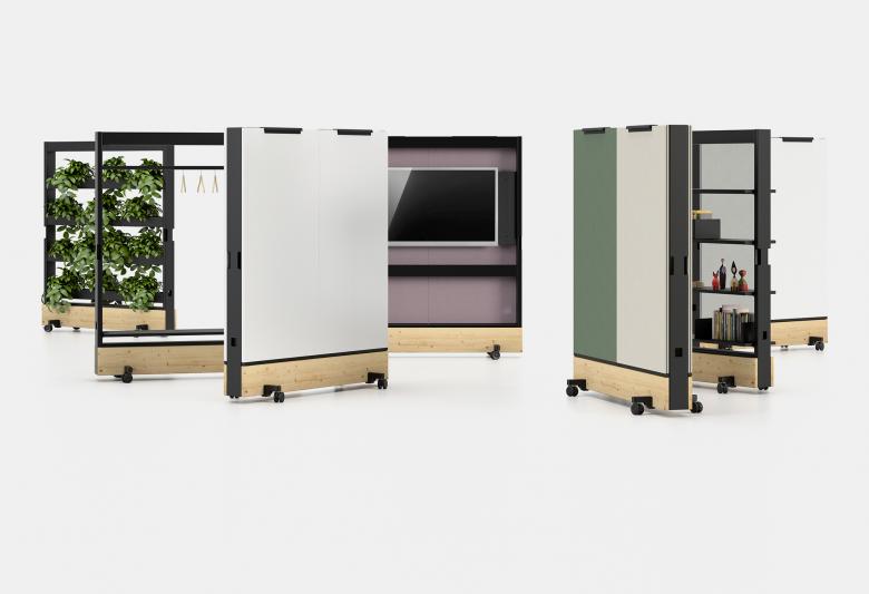 Mit der mobilen Trennwand lassen sich Räume ganz einfach in flexible Zonen gliedern. Die Dancing Wall besteht aus einem Metallrahmen, der mit verschiedenen Elementen bestückt und so in unterschiedlichen Ausführungen genutzt werden kann: Als Bücherregal, TV-Wagen, Garderobe, Pflanzenwand oder als vertikale Arbeitsfläche mit abnehmbaren Whiteboards und Pinnwänden.