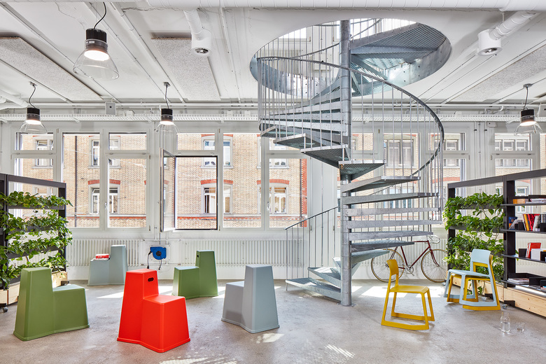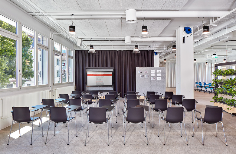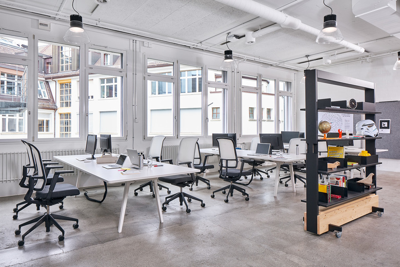 Dank dem neuen Wand- und Möblierungssystem von Stephan Hürlemann ist jeder Bereich unterschiedlich nutzbar. Mit fahrbaren Modulen – darunter Wände, die individuell mit Schallschutz-Elementen und Whiteboards bestückt werden können, Bildschirmwagen, Regale, Garderoben und Pflanzenwagen – kreieren die Mitarbeitenden jene Arbeitssituationen, die sie gerade benötigen. Im Handumdrehen gestalten sie einen Meeting Corner zu mehreren Arbeitskojen, ein Präsentationsforum zum Rückzugsort oder eine Bibliothek zur Gäste-Garderobe um. Ergänzt hat Hürlemann das innovative Konzept durch eine eigens entworfene schalloptimierte Telefonbox, die mit einem Hubwagen versetzt wird. Ein radikales und bewusst einfach gehaltenes Elektrokonzept unterstützt die Wandelbarkeit der Räume.