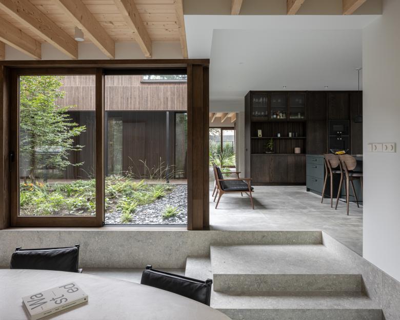 The design of the open park villa by i29 architects is meticulously tailored to the diversity of it's environment. The interplay of greenery, varied ground levels, and long sightlines creates a diverse living experience. The spread-out living floorplan on the ground floor forms as one connective space in the interior, unlike the fragmented uniformity of a single compact exterior volume. This design generates a multitude of experiences within the interior. Light shifts throughout the day, illuminating different areas but occasionally returning to certain spots later in the day. The integration of a central patio enhances the cohesion of the entire ground floor layout, providing air, light, and space. This connection blurs the lines between indoor and outdoor, intensifying sightlines and elongating them. Varying ceiling heights and finishes within the rooms clearly delineate distinct areas and functions within the house. Each space has its own ceiling height and finish. The living area is sunken into the landscape, constantly altering the perspective of the occupants and enriching the spatial experience.