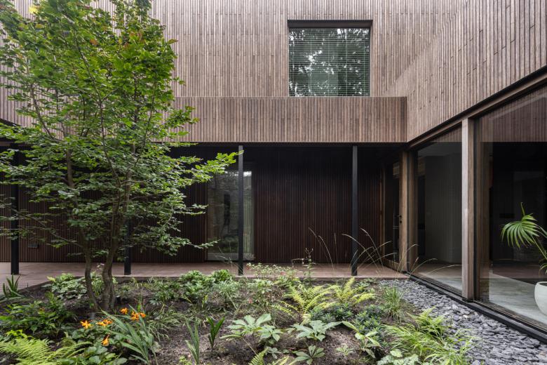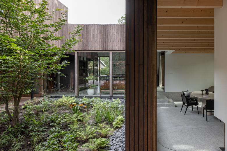 The five interconnected volumes of the villa differ in size and positioning, creating a diverse exterior appearance from all sides. The consistent minimalist detailing of the facades and canopy in clip bamboo amplifies the sculptural quality of the structure. The garden design complements the carefully crafted outdoor space, tailored to the villa's volume and facade openings, completing a harmonious interplay of architecture, interior, and landscape.