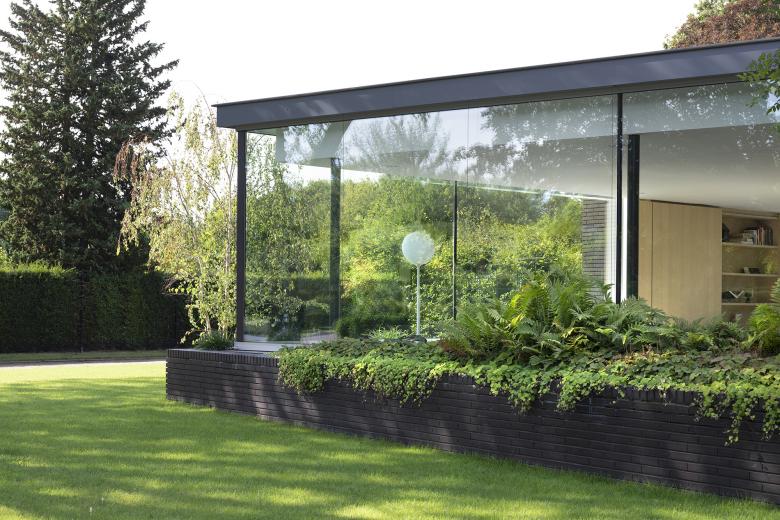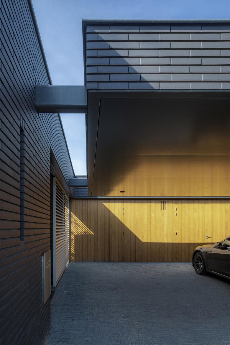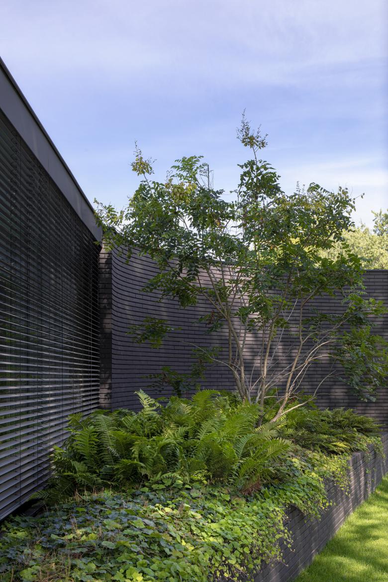 The all black brick facades hide and show its natural surroundings, and large integrated planters with greenery are integrated right at the frontside of the building. The house is built for effective use of energy, with a geothermal energy storage, a heat pump and solar collectors on the roof. The goal was to connect the inside with the outside naturally.