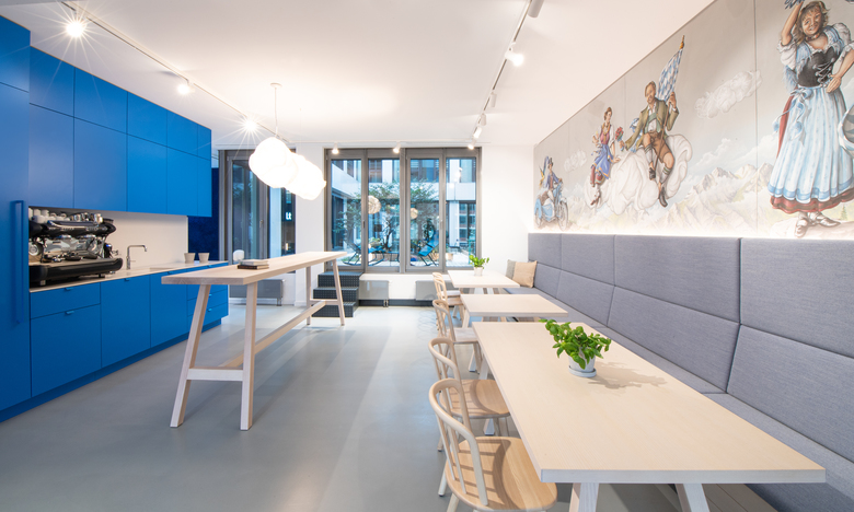 Durch die neue Grundrissgestaltung wird der Blick auf die volkstümlich charakteristische Lüftlmalerei im kommunikativen Herzstück, der Townhall gelenkt. Die Sonderanfertigung des Künstlers Bernhard Rieger zeigt führende Persönlichkeiten des Unternehmens und bringt mit Augenzwinkern einen Hauch bayrische Tradition in die Räumlichkeiten. Der Gemeinschaftsbereich dient als Treffpunkt, Meetingraum und Playground zugleich. Entsprechend seiner Funktion werden typische Elemente eines bayrischen Wirtshauses zitiert und mit einer modernen Formensprache, sowie der Corporate-Farbwelt ergänzt.