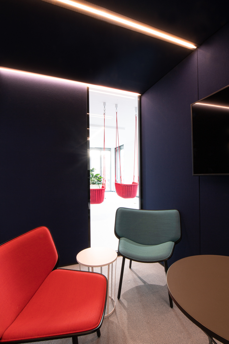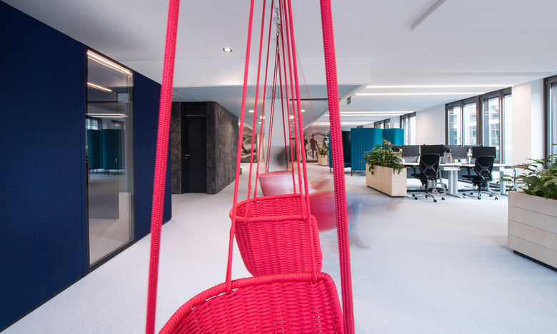 Der offene Bürobereich wird durch großflächige Schwarzweißphotographien von Eisbachsurfern und dem Englischen Garten eingerahmt. Im Open Office schaffen, ergänzend zu privaten Rückzugsbereichen und Besprechungsräumen, Schaukeln eine agile Arbeitsstruktur. Hierdurch werden vielseitige Möglichkeiten geschaffen konzentriert und gemeinschaftlich zu Arbeiten.