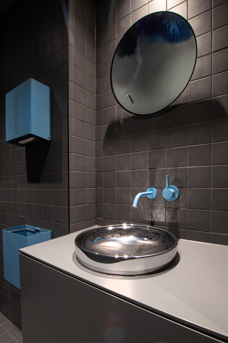 Bereits vom Treppenhaus aus leuchtet der blau gestaltete Empfangsbereich durch die neue offene Willkommenssituation. Die geschwungene Form des Tresens nimmt Bezug auf die Eisbachwelle. Der farbige Wandteppich erinnert an Korallen, die sich sanft auf einem Riff wiegen.