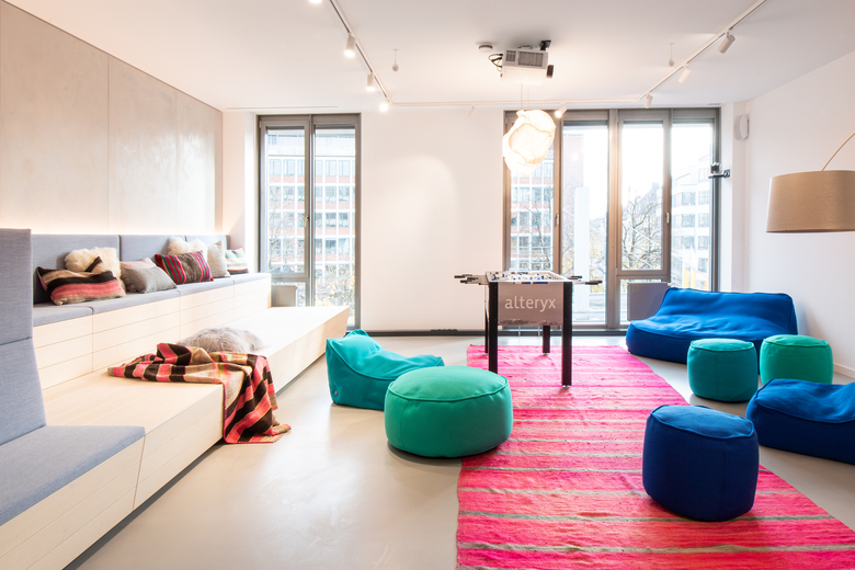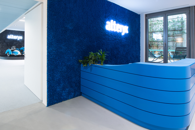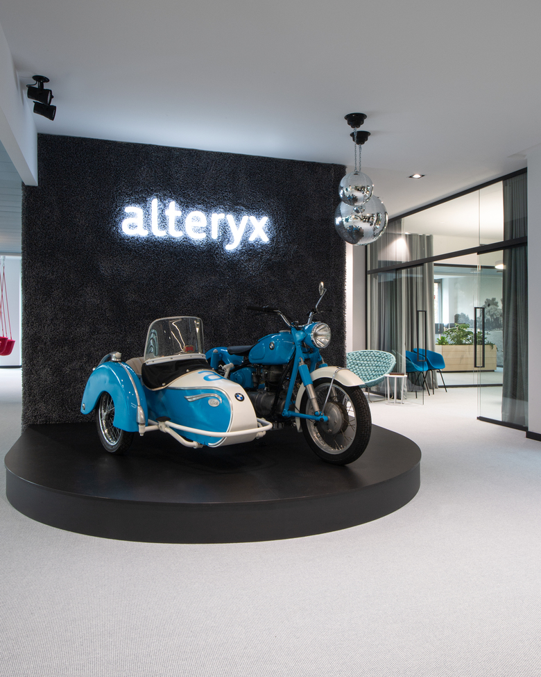 Die Mittelzone wird durch den Wandteppich hervorgehoben, der sich gleichzeitig positiv auf die hohen akustischen Anforderungen in den offen gestalteten Räumlichkeiten auswirkt. Zentraler Blickfang ist der BMW-Classic, eine Steib mit Seitenwagen im Alteryx Corporate-Blau. Zur Feier eines großen Deals ertönt durch Drücken der Hupe Musik und die Diskokugel setzt sich in Bewegung.