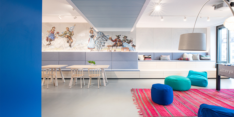 Alteryx ist ein schnell wachsendes, amerikanisches Unternehmen mit Freude an ungewöhnlichen Ideen. An jedem Standort sollen zum einen die Philosophie der Marke, die dynamische Farbwelt, aber auch lokale Besonderheiten spürbar sein. Das neue „Munyx“ Office in der Münchner Innenstadt integriert Elemente aus München und Bayern in die Gestaltung der Räumlichkeiten.