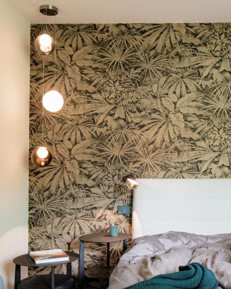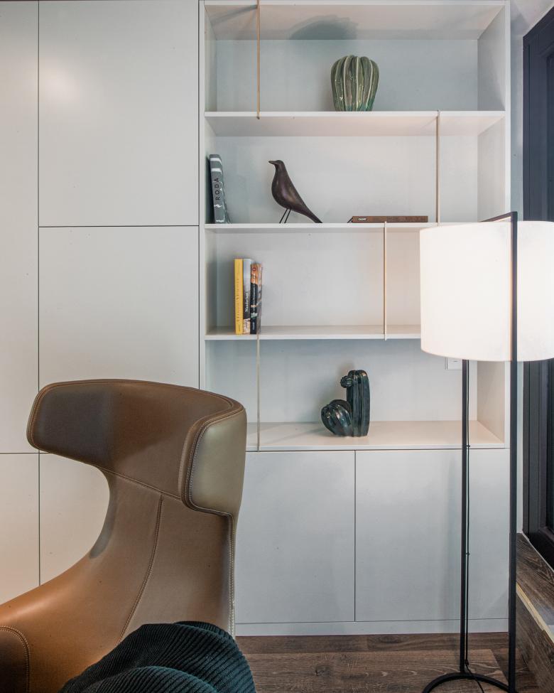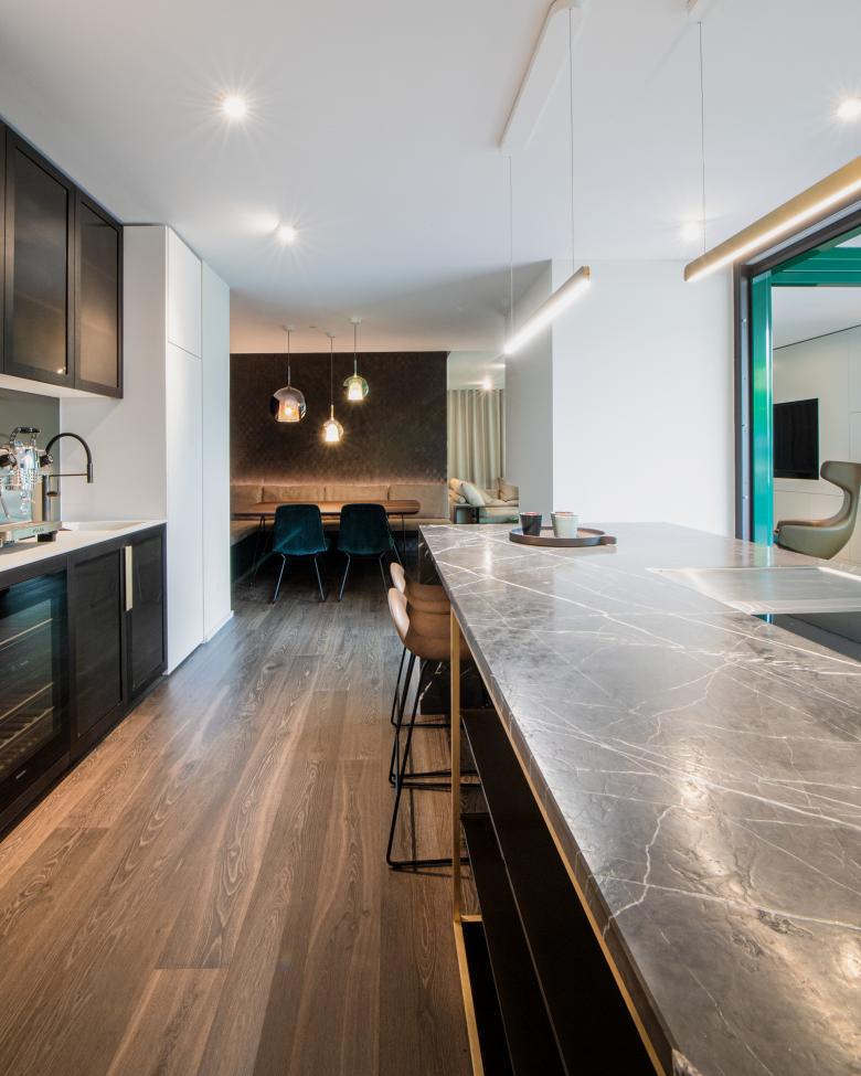 The apartment at the English Garden, renovated by iam, is part of an apartment building from the 60s. The floor plan was broken up according to the requirements of the client to create new spacious living spaces. Dark parquet flooring and a warm colour scheme create a livable ambience with well thought-out visual references to the green surroundings. The façade design of the existing building as well as the green surroundings are adapted into the interior concept by colour-corresponding elements. The interior concept is restrained with light colours of the fixtures and is accentuated by selected fine patterned wallpaper and brass details as keymotif.