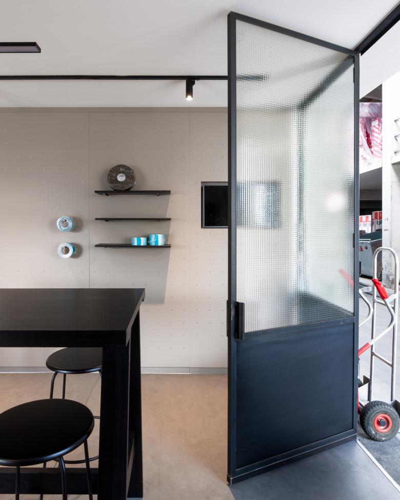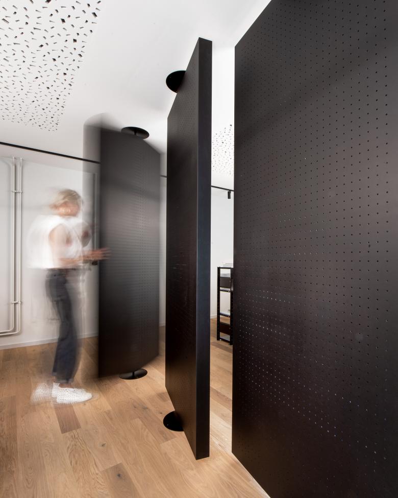 In Zusammenarbeit mit ausgewählten Handwerksbetrieben wurden individuelle Lösungen, wie die drehbaren Akustikelemente oder die Slatwall im Verkaufsbereich, für das Unternehmen entwickelt. Die handgefertigten Stahl-Glastrennwände und Untergestelle der Waschtische im WC verleihen den neuen modernen Räumlichkeiten persönlichen Charme.