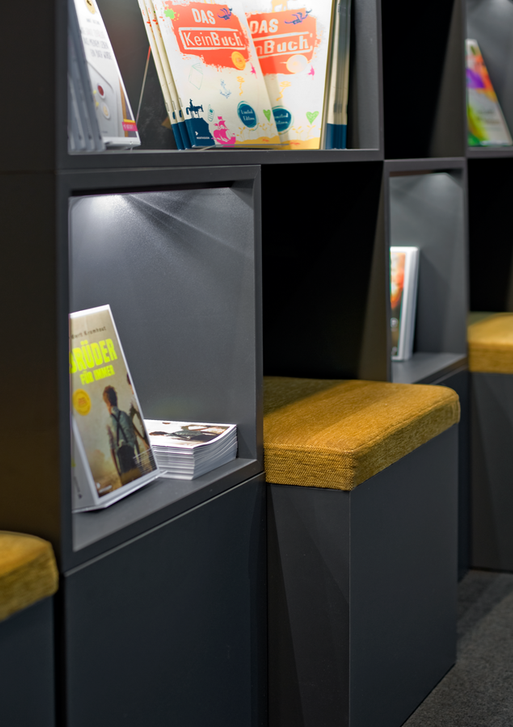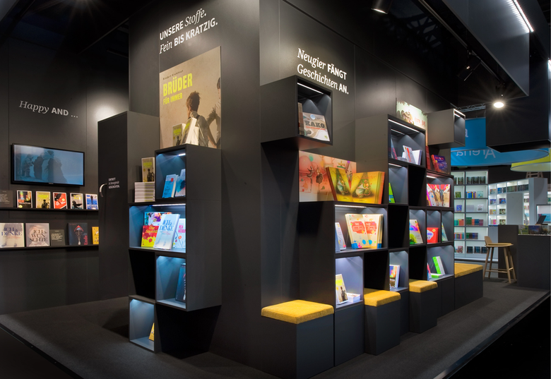 Eine nach außen hin komplett geöffnete Präsentationsfläche lädt den Besucher ein, näher an den Stand heran zu treten. In schwarzen, schlichten, rasterförmig angeordneten Kuben treten die Bücher mit ihren ansprechenden Illustrationen in den Vordergrund. Eine an der Rückwand angebrachte „Slatwall“ bietet zudem ausreichend Platz, um die Kinderbücher zu präsentieren. Hier wird außerdem der digitale Bereich des Verlages über iPads und einen Werbefilm erlebbar gemacht.