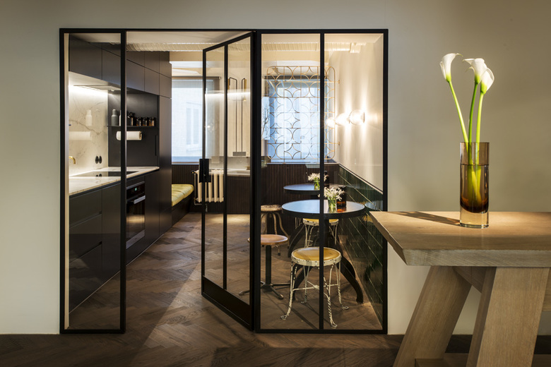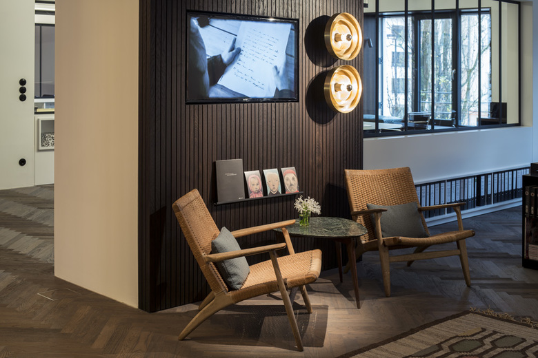 Die neuen Büroräume entstanden in der Leopoldstraße 25 in München im 3. Obergeschoss auf einer Fläche von ca. 300m2. Das Bestandsgebäude wurde komplett saniert und teilweise baulich erweitert. Der Bauherr wünschte sich ein stilvolles Objekt, das neben den technischen Voraussetzungen für den Ausbau auch Raum für Gestaltung und Individualität bietet. Handgearbeitete, schwarz lackierte Stahlrahmen-Glas-Elemente dienen als Trennung der verschiedenen Bereiche und Büros. Mögliche Blickbeziehungen und Kommunikationspunkte wie der große Stehtisch in der Mitte des Flurs sorgen trotzdem für eine offene Arbeitsatmosphäre. Rückzugsmöglichkeiten bieten der Besprechungsraum sowie die Telefonbox und die Küche. Fein aufeinander abgestimmte Materialien und ausgesuchte Möbel- und Accessoires im Stil der 60er Jahre bringen Wohnlichkeit und Wärme in die Räume. Durch hochwertige Materialien wie Messing und Marmor werden auch in den Sanitärräumen und in der Küche Akzente gesetzt. Um das einzigartige Büro-Konzept abzurunden wurde eine besondere Beleuchtung ausgewählt, die teilweise speziell für Mixtvision entwickelt und angefertigt wurde.