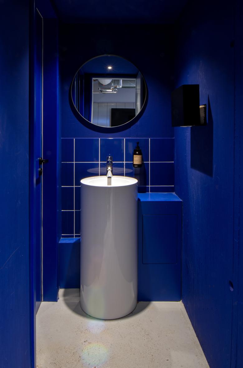 Im Umkleidebereich treffen stereotype Wandleuchten auf architektonisch anmutende Fließen und verspielte Hocker aus Recyclingmaterial. Die Farbe Kobaltblau ist Blickfang und setzt Akzente in den Räumlichkeiten. So ist die kleine Toilette monochrom gestaltet und leuchtet in dem kräftigen Farbton.