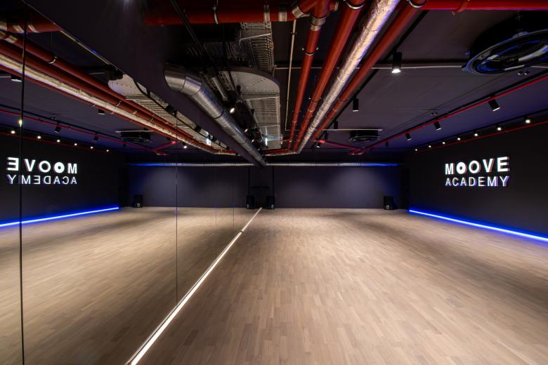 Die Hip-Hop-Tanzschule, die sich im Untergeschoss eines Einkaufszentrums in München befindet, wollte in ihren neuen Räumlichkeiten den Ansprüchen des jungen Publikums gerecht werden. Es sollte eine Atmosphäre geschaffen werden, die eine besondere Kulisse und Bühne bietet, um in den Social Media aufzutreten und Videos zu drehen.