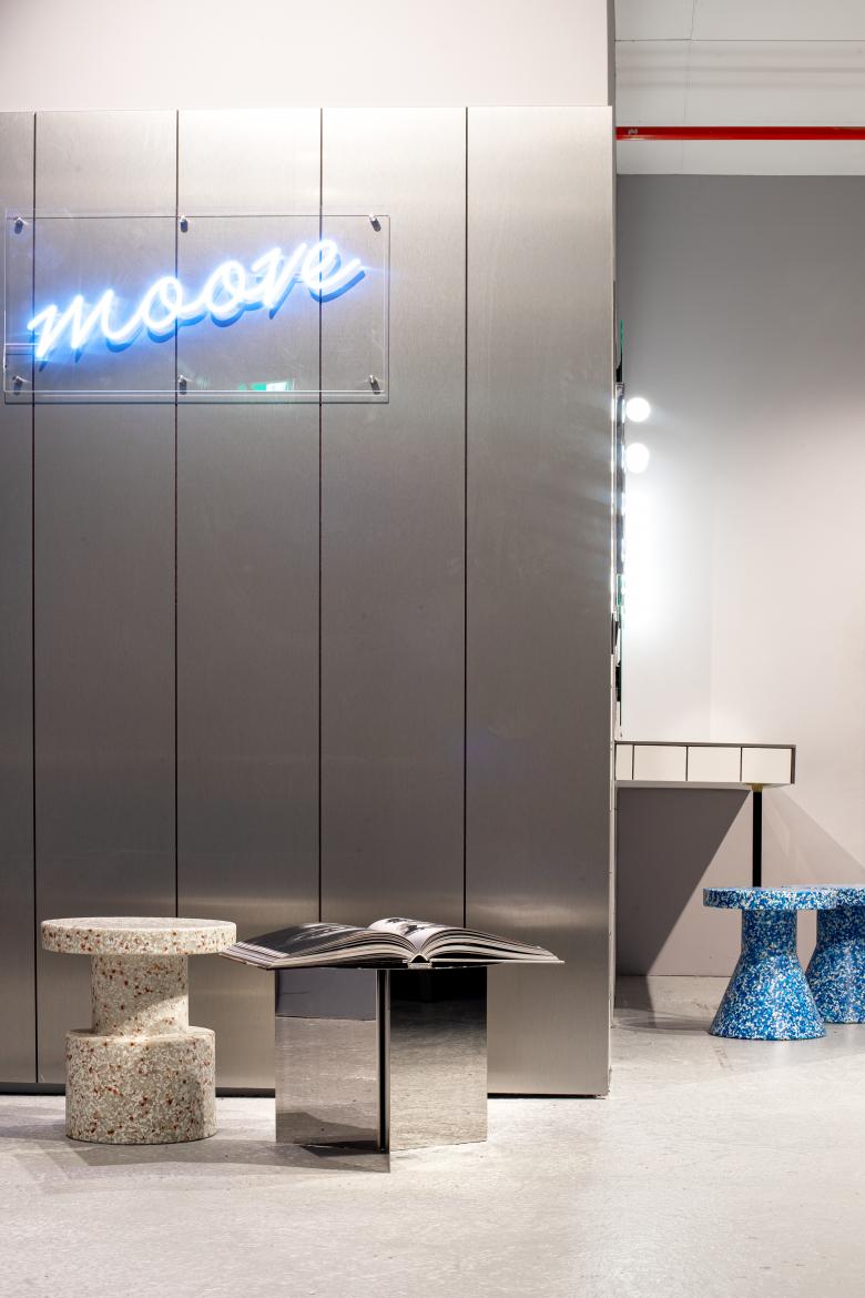 Der Eingangs- und Wartebereich wird durch den verspiegelten Tresen, Wandverkleidungen und Stauraum mit Edelstahloberfläche optisch vergrößert und vermittelt durch die besondere Materialwahl ein modernes und cooles Ambiente. Merchandising-Produkte wie T-Shirts und Pullover werden in den Ausstellungsregalen aus Metall zum Blickfang.