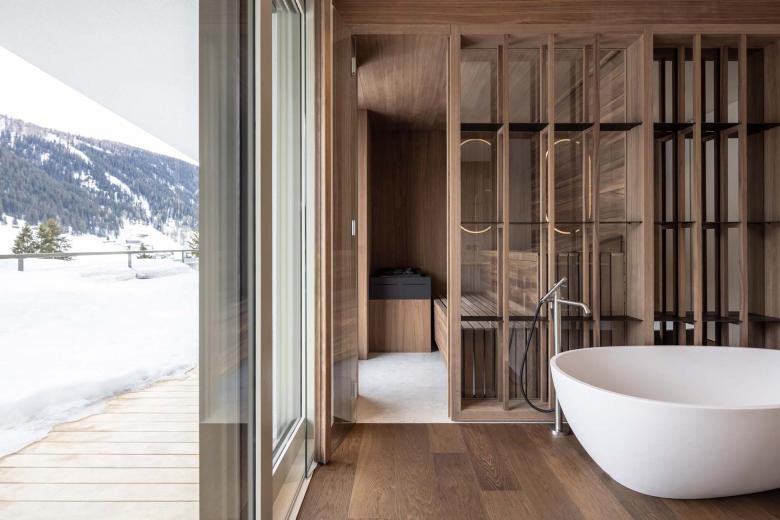 Als Gegenstück zum Block aus Stein im Wohnbereich entstand ein weiterer dominanter Materialkubus als Holz im Masterbad und -Schlafzimmer.