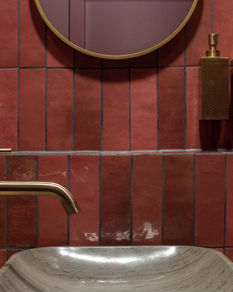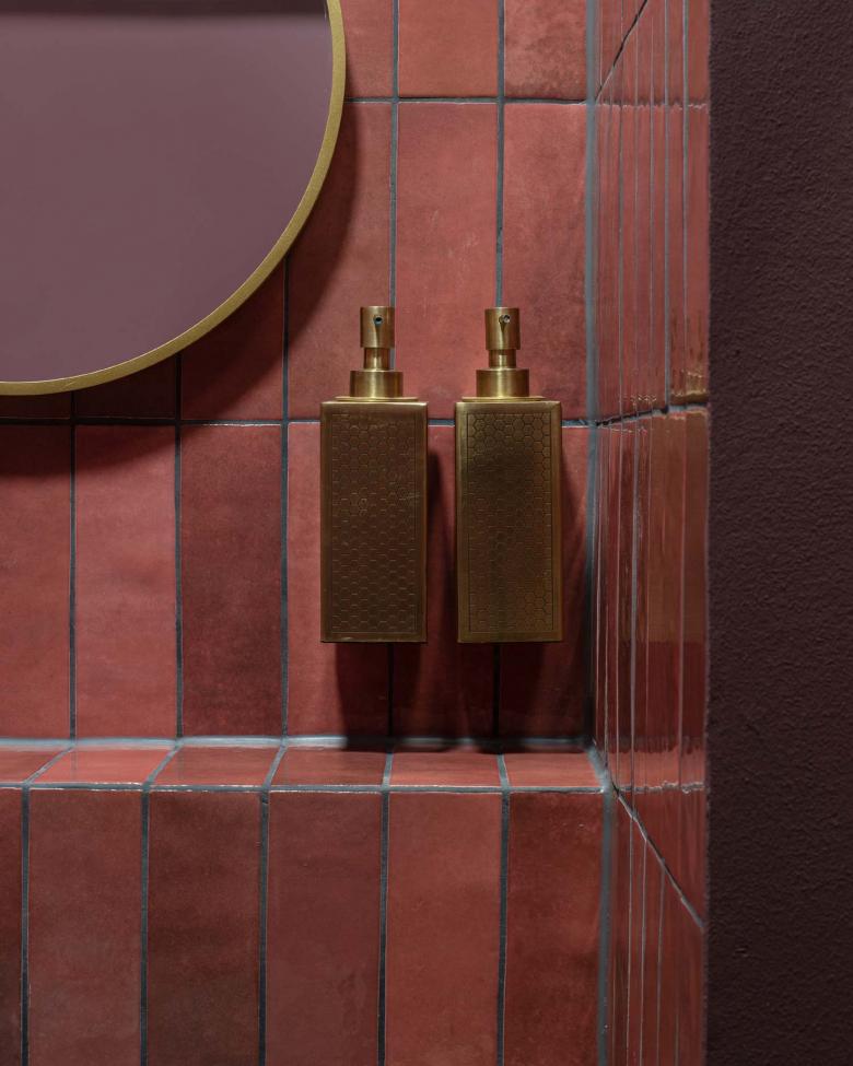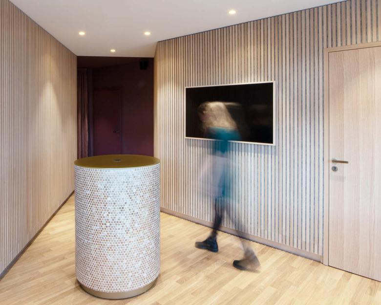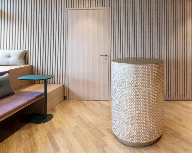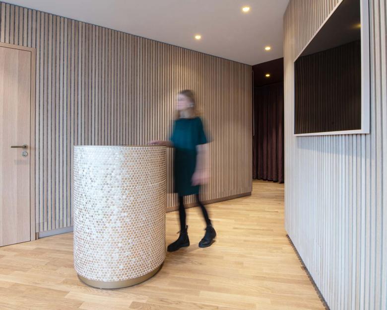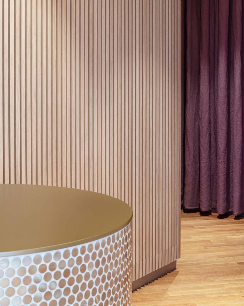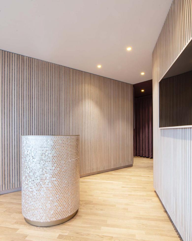 Durch den Einsatz klarer architektonischer Elemente, wie der Lamellenwand, großzügigen Sitzstufen zum Fenster hin und farblich, sowie im Material monochrom gestalteten Nischen und Bereichen, erhält der verschachtelte Raum Tiefe und Ruhe. Um den kompakten, runden Empfangstresen, ganz in goldenen Mosaikplättchen gefliest, öffnen sich die Türen zu den beiden Behandlungsräumen; ganz dem Motto der Bauherren getreu: relax& smile.