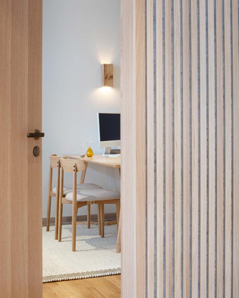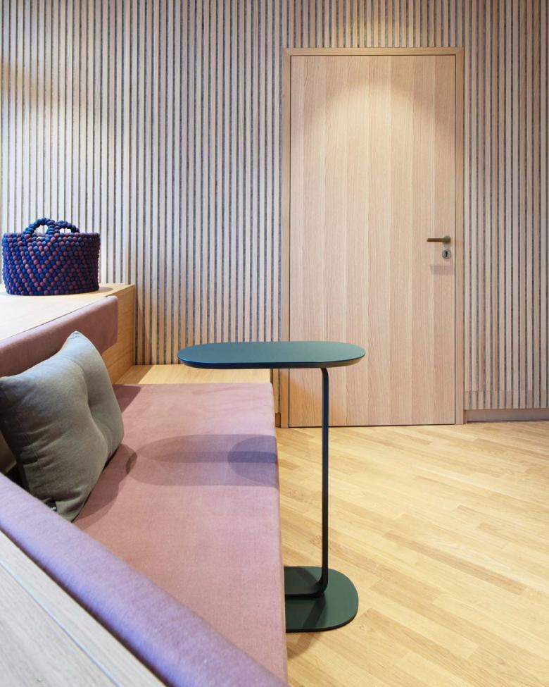 Auf etwa 70 m² im Erdgeschoss des Gebäudes befinden sich ein Warte- und Empfangsbereich, zwei Behandlungsräume, eine Teeküche für Mitarbeiter und ein WC. In den neuen Räumen sollte die Verbundenheit zu und das CI der bestehenden Praxis zu spüren sein, sich gelichzeitig mit einem zeitgenössisch modernen Ambiente abheben. Warme Materialität und eine wohnliche Atmosphäre waren den Bauherren besonders wichtig.