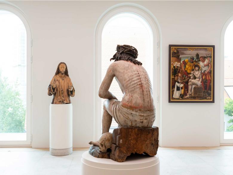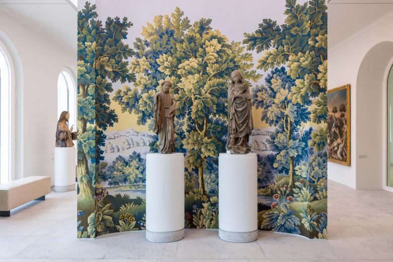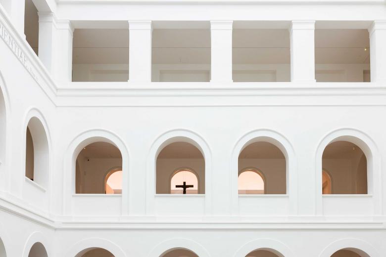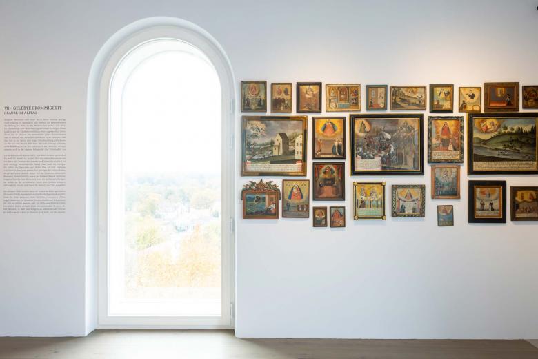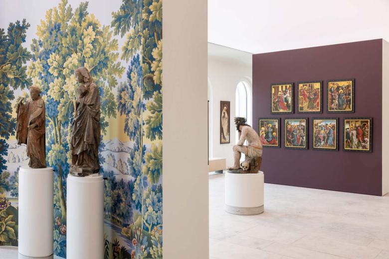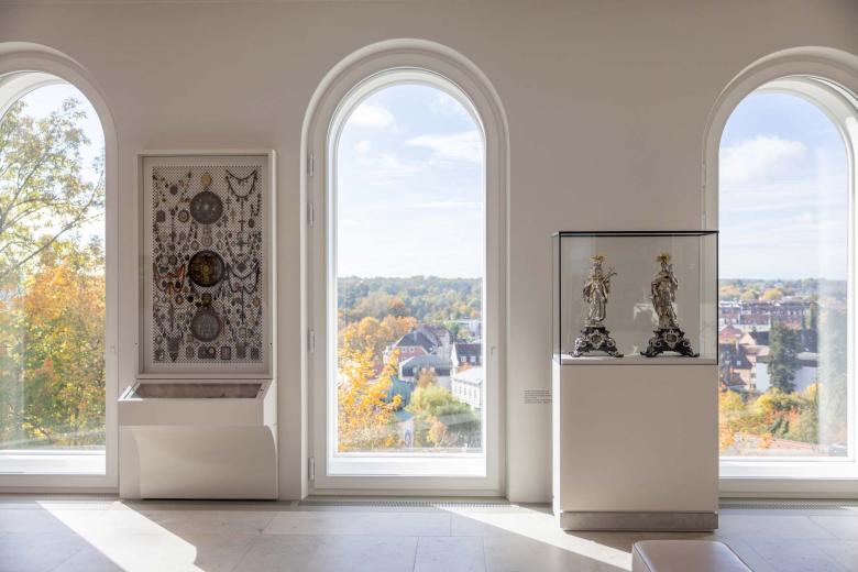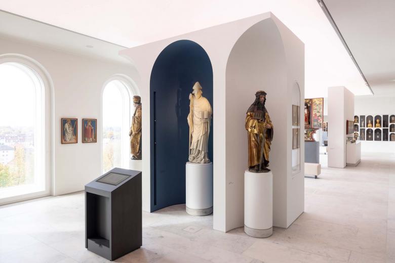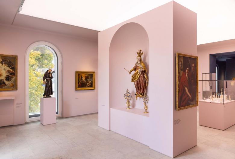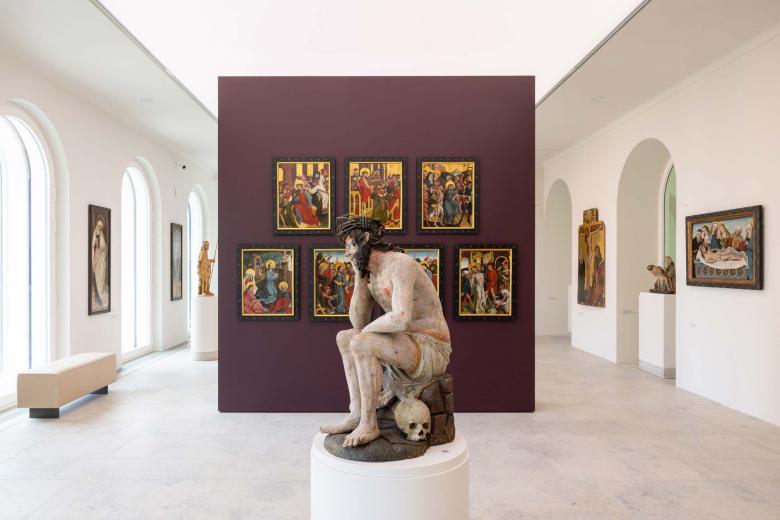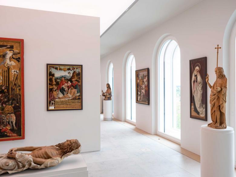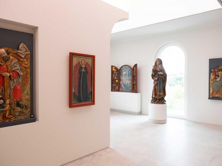 Das wichtigste Kunstwerk befindet sich in der Mitte der Sammlung, im tiefblauen Raum. Es handelt sich um das "Freisinger Lukasbild" (1235 n. Chr.), ein Objekt, das dazu bestimmt ist, in einem Altar hinter Türen aufgestellt zu werden und nur wenige Tage im Jahr zu sehen zu sein. Um dieses Erbe zu rekonstruieren, wurde die Öffnung dieser Wand mit denselben Abmessungen und Formen wie die Altartüren versehen. Das Stück ist nun jedoch nicht mehr verdeckt, sondern für alle sichtbar. Auf der anderen Seite des Hofes befindet sich die Lukas-Kapelle, eine permanente Installation des amerikanischen Künstlers James Turrell. Diese beiden Werke bilden einen Kontrapunkt und stehen durch ihre gemeinsame Achse in einem ständigen Dialog.