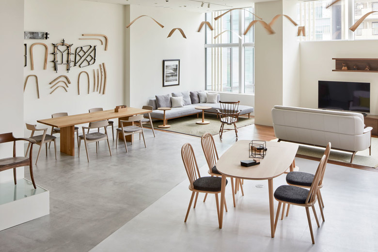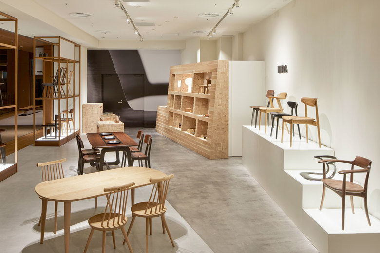 A store where you can experience Hida Takayama furniture. Hida Sangyo, the company that operates the shop, is a woodworking furniture manufacturer that continues to develop cedar, which was once considered unsuitable for furniture, into furniture. To make their skills felt everywhere, the facade is made of 50% compressed cedar wood, and craftsmen’s tools are displayed on the wall to visualize their skills and to increase the affinity between the users and the manufacturer.