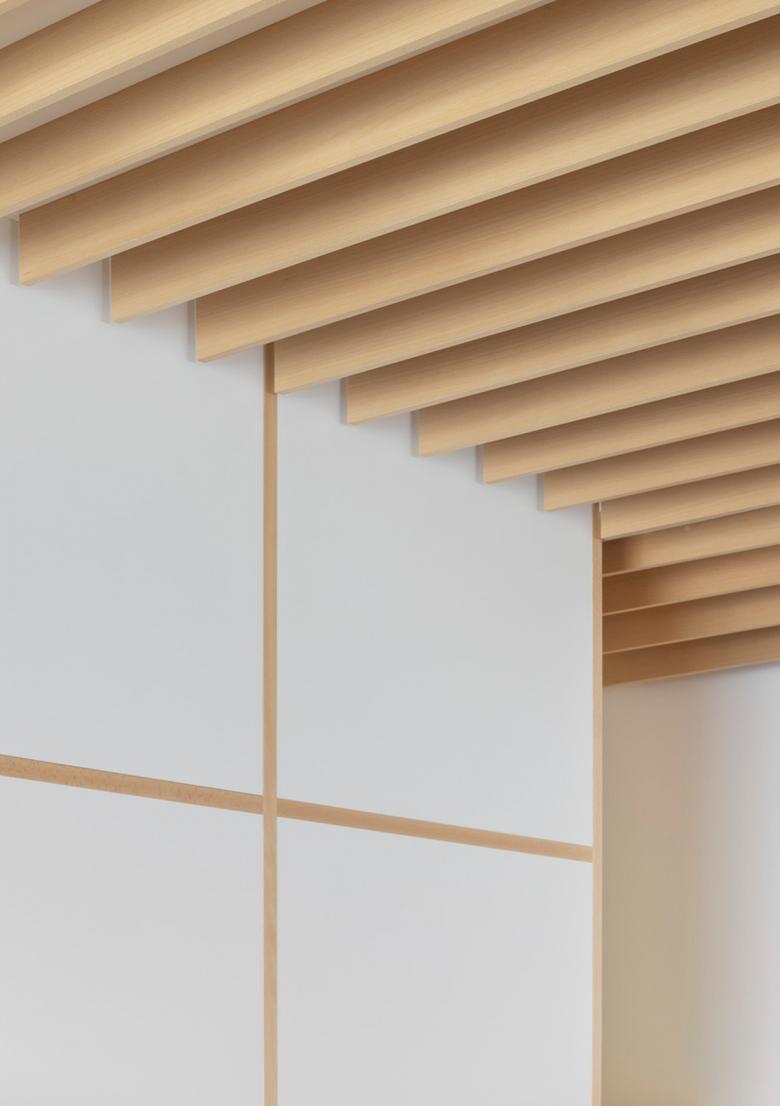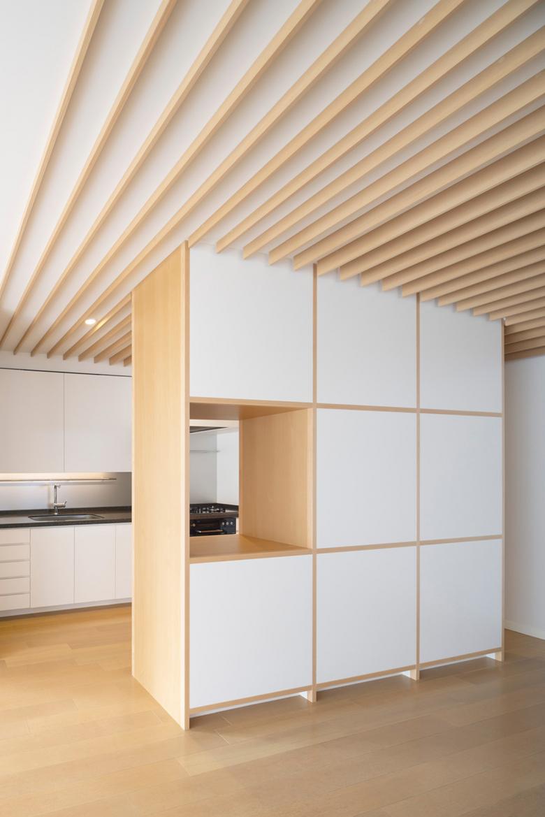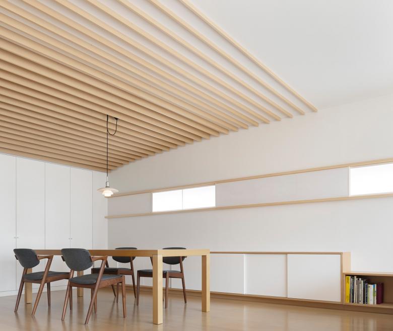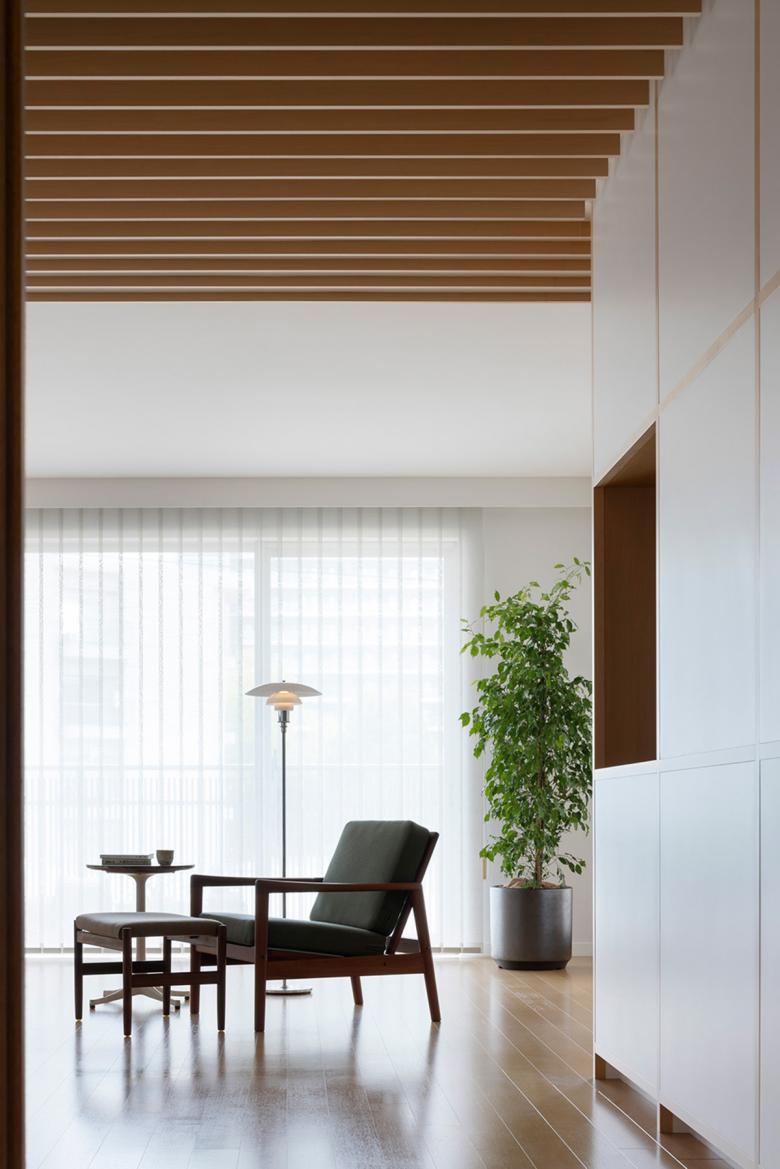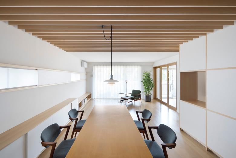 Rhythmic louvers, installed to eliminate the difference in the ceiling level, tie the dining room space together. Around the windows, shoji screens with the cleats on the reverse side allow for different views during the day and at night. In addition, bookshelves extending from the dining room to the living room connect each room, creating a sense of unity in the space. The furniture design is based on beech wood and off-white tones, and the light gray walls harmonize with the existing furniture, creating an elegant atmosphere.