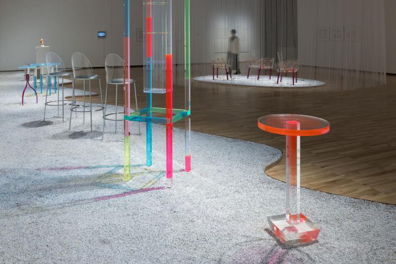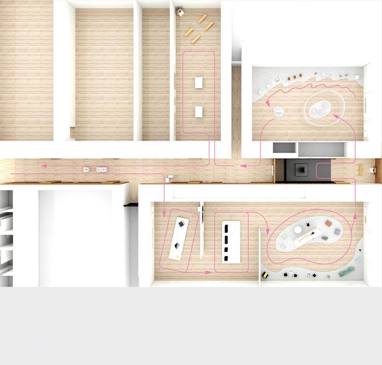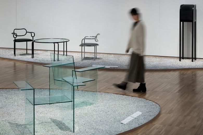 The exhibition structure is divided into four rooms and unfolds chronologically from chapters 1 to 4. In the first half of the exhibition, chapters 1 and 2, three-dimensional works are arranged on a stage in different layouts: one row for chapter 1 and two rows for chapter 2. The timelessness of the works is highlighted by the materials used in the works, which incorporate transparency, monotone, and light.