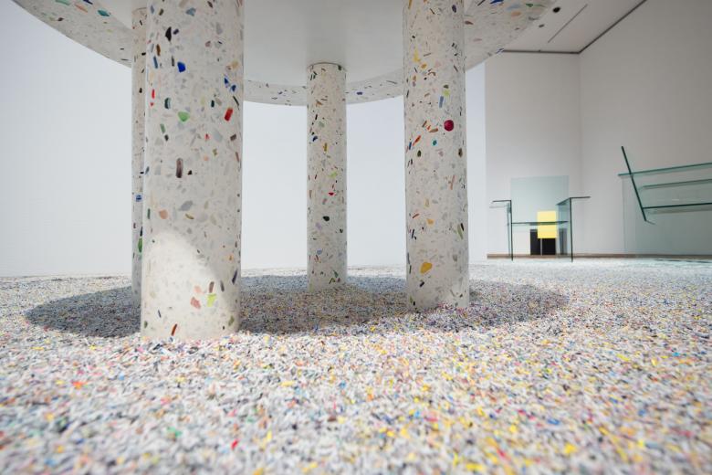 In the latter half of the exhibition, chapters 3 and 4, the freehand lines are further extended, allowing visitors to enjoy the exhibit as if they were walking around in the sketches. The works are placed directly on the floor and are designed to be viewed at the height of use. Underneath the exhibited works along the freehand line are pieces of paper cut into small pieces from past exhibition flyers used at the Toyama Prefectural Museum of Art. This creates a sense of unity between the exhibition space and visitors, allowing them to enjoy a visual experience reminiscent of snow and sand. This shredded paper strip arrangement was chosen because of its suitability for laying out curves. These pieces of paper were produced with the help of local volunteers. The task of creating such a large quantity of paper strips must have been difficult, but we were told that they cooperated with the museum as it was a pleasure to be involved in the display of the museum’s collection.