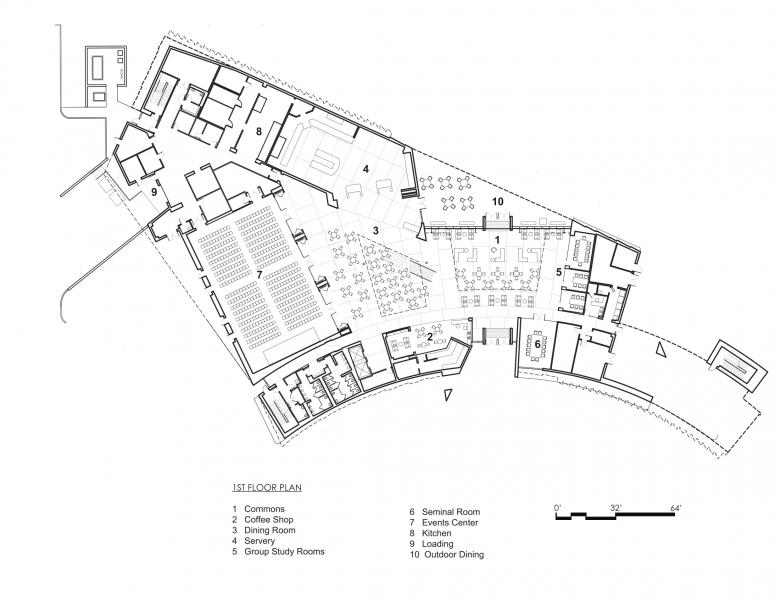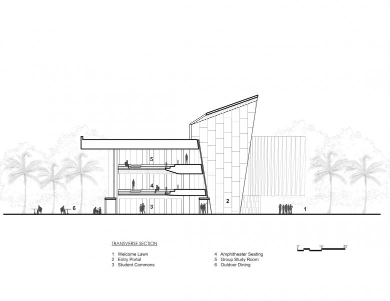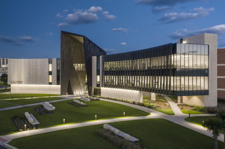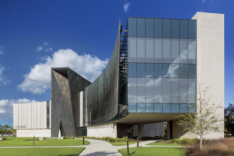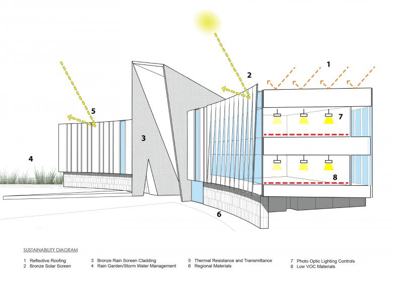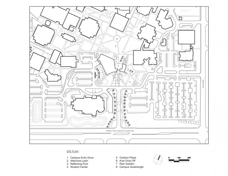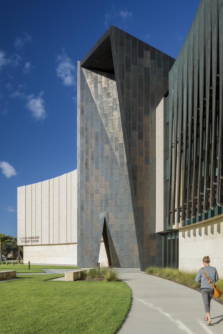 Like a coral stone outcropping rising from the Floridian shoreline, the 74,000-square-foot L. Gale Lemerand student center at Daytona State College establishes an iconic presence to the campus along the main arterial road connecting the famed Daytona beachfront with the rest of Florida. The organically curving stone and bronze wall faces the road and embraces the visitor like two outreached arms forming a landscaped welcome lawn at the campus entry. Rising from the center of the gently curving wall is a bronze portal framing the opening to the student center and giving passage to the main quadrangle and campus beyond. Internally a three-story commons overlooks the quadrangle and serves as the campus living room. Dining, a coffee shop, gaming lounge, and group study rooms ring the student center commons. An amphitheater on the second and third floors cantilevers into the commons and looks out onto the campus quadrangle. The amphitheater provides a theatrical experience giving students the ability to see and be seen, thereby reinforcing a sense of community, and belonging. Other program components housed in the student center include a 500-person events center, student club and organization offices and workspace, classrooms, career services, the writing center and the College library. The educational and recreational programs enhance student life at Daytona State College and provide critical support services for transition to the work force. The center is designed as a high performance two Green Globe facility. Custom bronze perforated solar screens are veiled over large, glazed areas of the south and west facades to limit heat gain and glare while allowing views outward. Additionally, a ventilated bronze rain screen reduces heat gain in the harsh Florida sun. Other sustainable strategies include the use of pre- and post-consumer recycled materials, reclaimed rainwater, photo optic lighting, and high-efficiency heating ventilation and air conditioning systems.