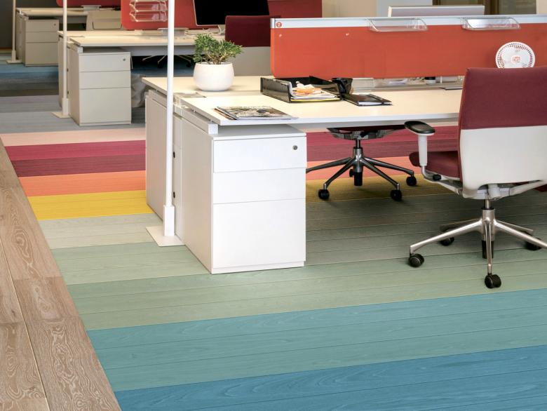 Ikuta created Gradiente flooring to bring color to interior spaces. Produced with dyed wood veneer in a rainbow of colors from the Italian company Tabu, Gradiente makes flooring more fun.