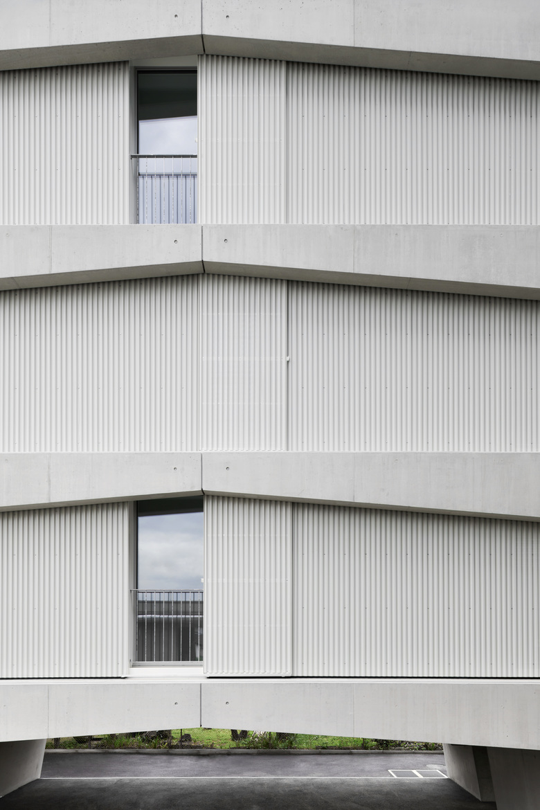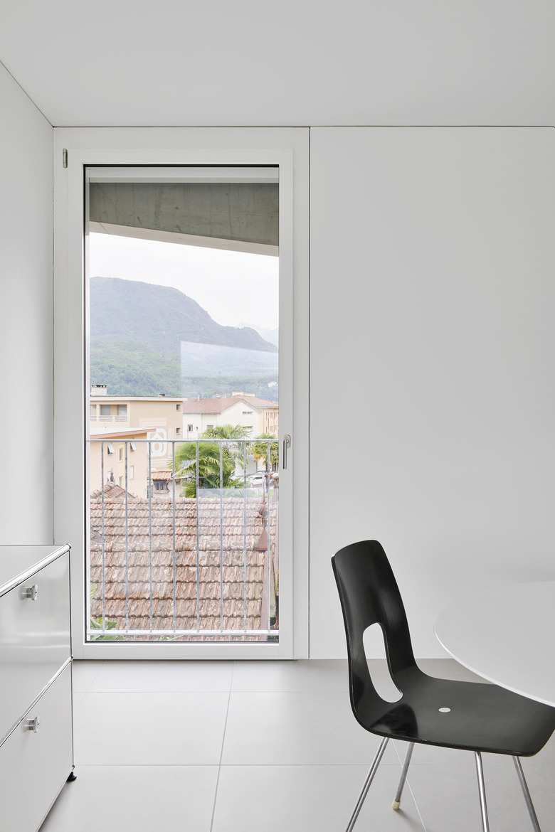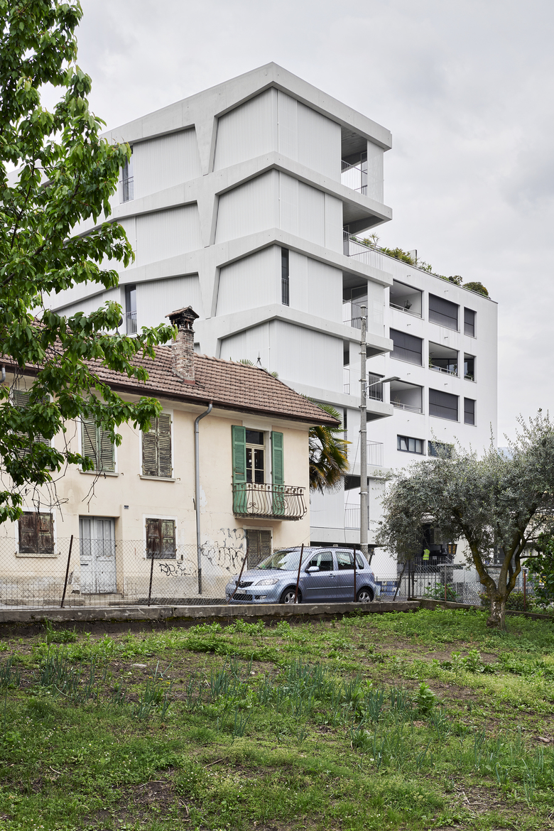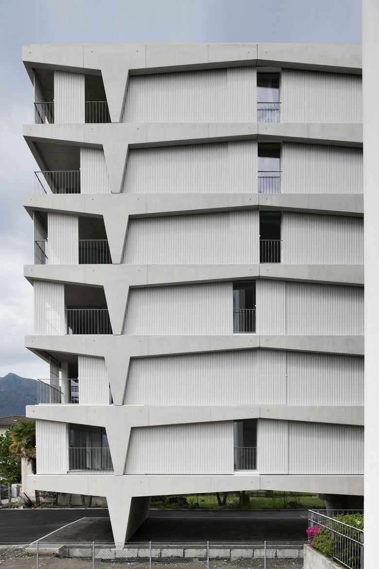 Boundary distances and building laws determine the volume of the building. Extending over six storeys, the palazzo houses one apartment per floor and is a hybrid construction. On the one hand, it shows its dignity and urban integrity by turning the load-bearing structure outwards, thus determining the façade, while on the other hand, the prefabricated façade elements made of perforated sheet metal do not negate the semi-industrial and handcrafted character of the place. The architecture of the Palazzo Pioda responds to the dynamics of its setting by recalling the integrity of a modernist expression and thus creates a dialogue with the old «Tendenza» masters from the Ticino region.