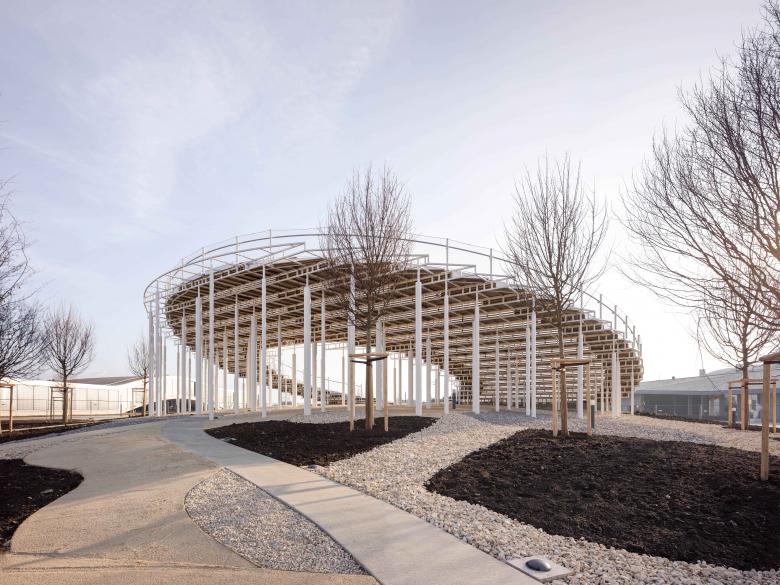 The Agora Lombard Odier emerges from the ground on the Cosandey Square, south of the EPFL Campus, like a large disc that rises and seeks the view over Lake Geneva and the Alps. The disc, which is supported by a series of tubular steel columns whose arrangement evokes a forest, becomes a shaded canopy underneath. These 31-m diameter stands for outdoors activities can accommodate up to 600 people.
