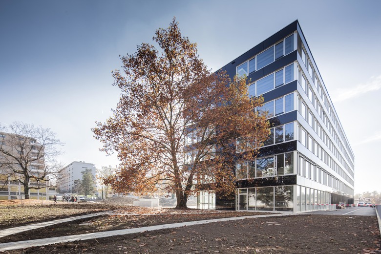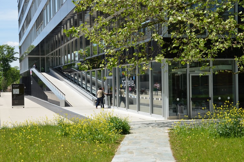 The building of the Management School of Geneva consists in a longitudinal volume of large dimensions which accommodates a demanding building program while conforming to the heritage and architectural qualities of the Battelle Campus. Like a spine running along the building, the circulation spaces and service areas are grouped together at the building center, whereas the classrooms are located around the periphery. The load-bearing structure manifests the program’s spatial organization: ribbed slabs span from a central, longitudinal load-bearing core to the perimeter columns.