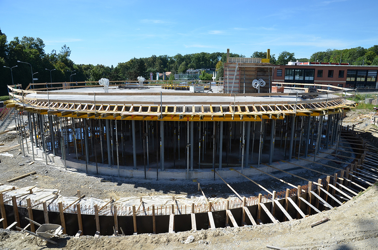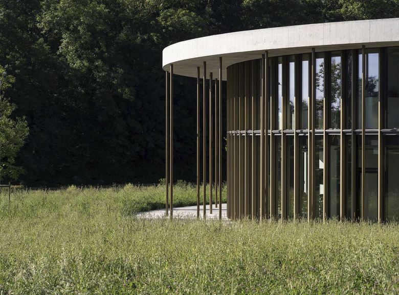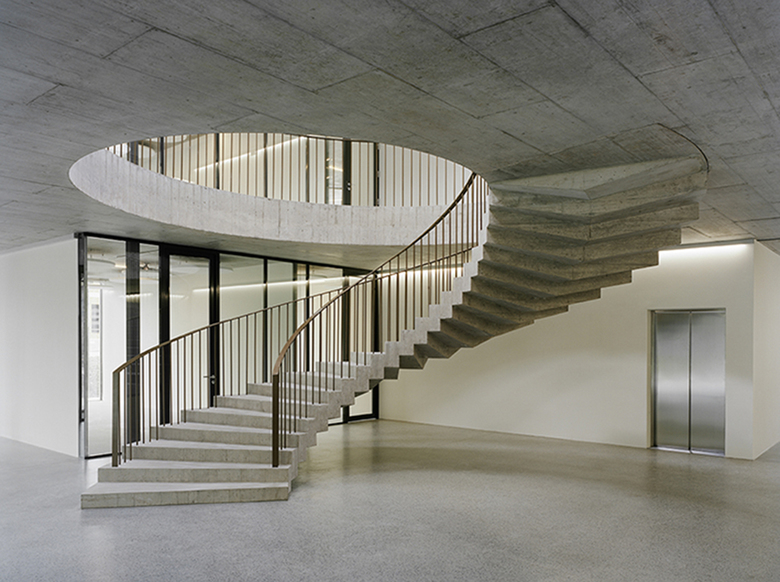 The FIM (International Motorcycling Federation) new headquarters building uses a rounded shape which evokes the movement and speed associated to motorcycling. Two ovoid, exposed concrete slabs connected on their perimeter by an array of steel columns shape the building. In its centre, the space gravitates towards a helical staircase made of in-situ concrete.