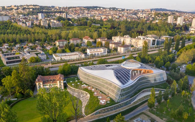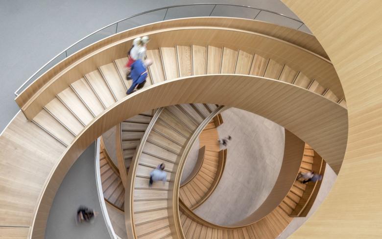 The new IOC headquarters building emerges from the ground on a plinth that blends into the surrounding landscape. The moving appearance of the emerging floors is emphasized by their relative rotation. The interior spaces gravitate around a large circular opening which houses the monumental staircase connecting the different building levels. This iconic staircase, which evokes the five Olympic rings, constitutes the actual core of the building, a light-flooded space simultaneously used as a lounge and circulation areas. The structural design sought a harmonious blending with the geometrical and spatial complexity of the architecture.