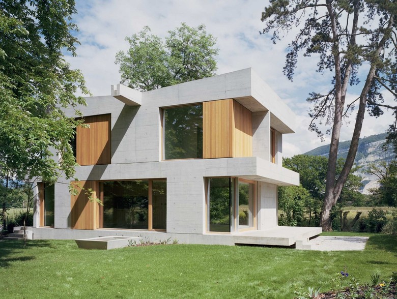 At the foot of the Salève mountain, the villa SMR presents itself in the form of a stack of three tables in reinforced concrete. These structural elements also shape the different spaces of the project. This small, exposed concrete structure is settled in a discreet and compact way in the countryside landscape.