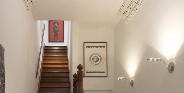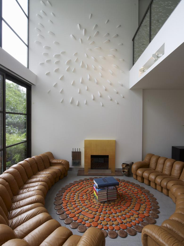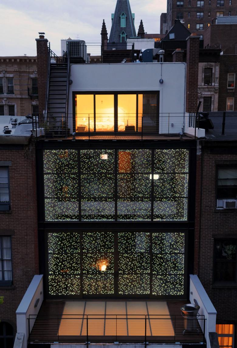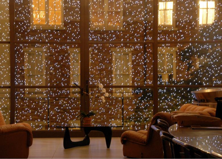 The outside wall is constructed with special glass panels, in which thousands of white LEDs are embedded. They seem to float in thin air and resemble stars in the night sky. For the other interior lighting we have used Schlitz Up, which are in some cases painted on the inside with a custom yellow colour. The entrance area is lit by Wandering Finger Wall and an Oh Mei Ma in Silver (not shown) These are both available from our standard collection.