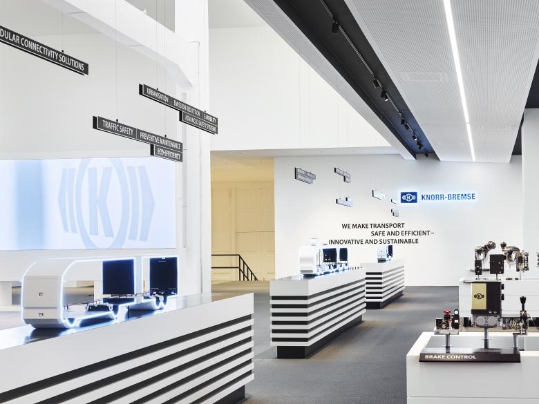 The atrium and the two exhibition areas are characterised by a distinct design idiom. This enables visitors to gain a quick and clear overview of all the individual topics on display in the forum. Knorr-Bremse can therefore offer guided tours tailored to specific target groups, as well as individual tours.