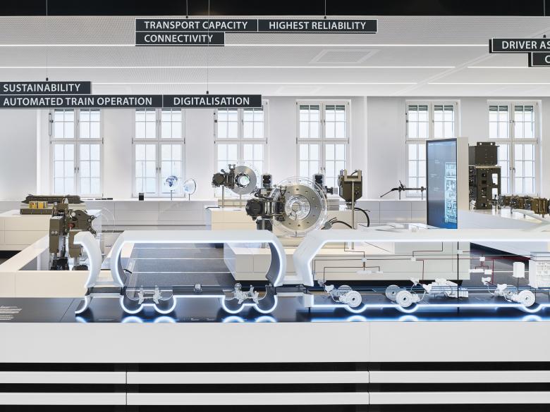 In the Portfolio section of each exhibition area, Knorr-Bremse products are presented in original size on themed islands. In each case, one product with particularly high requirements and corresponding relevance represents one vehicle type, while a miniature model of the vehicle type is located in close proximity. At the same time, the product is exemplary of the respective product and application type. In this way, vehicle-specific solutions can be presented, highlighted and elaborated in detail. The exemplary display of particularly innovative and high-performance products from Knorr-Bremse maintains its high significance for the entire product family.